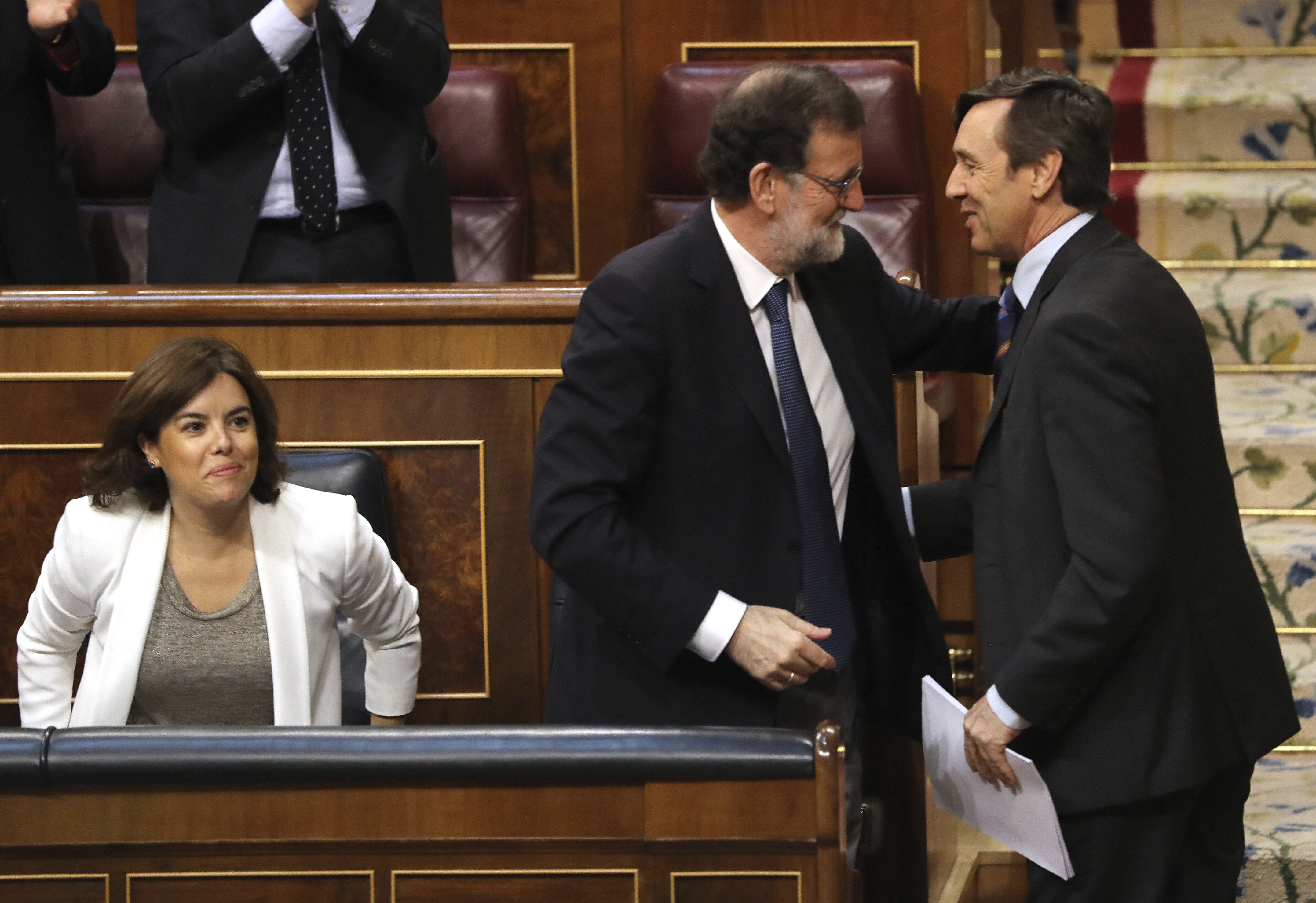 Mariano Rajoy saluda a Rafael Hernando en la bancada del Partido Popular.