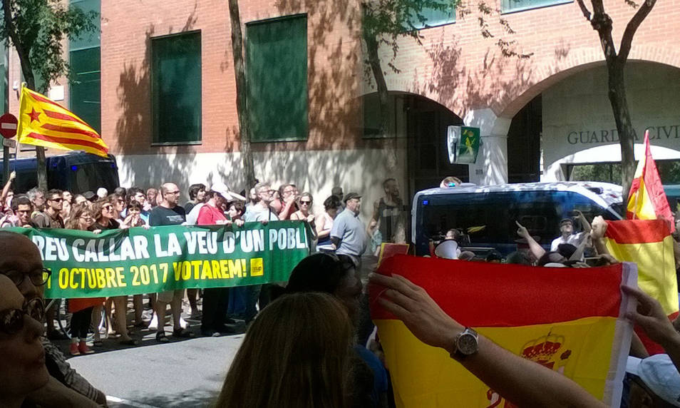 Los separatistas que iban a protestar frente al cuartel del Instituto Armado en Barcelona se encuentran una contramanifestación más numerosa.