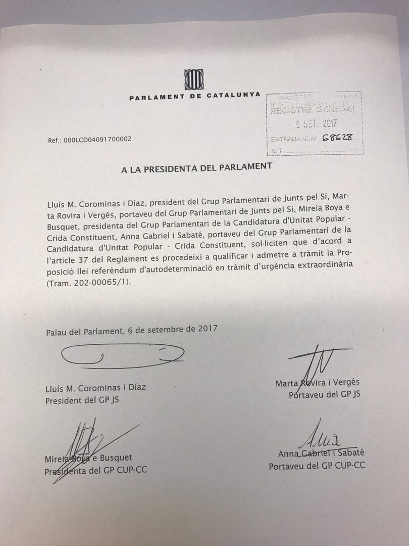 Se resolvía así el "misterio" sobre la táctica separatista para burlar al Gobierno y al Tribunal Constitucional. Los partidos separatistas forzaban al límite el reglamento de la cámara. Los grupos no tendrán ni las 48 horas preceptivas para estudiar el contenido de la ley. Rovira pidió varias exenciones, entre ellas el dictamen del Consejo de Garantías Estatutarias, sobre la base de que no es vinculante y si fuera contrario a la norma no lo admitirían.
