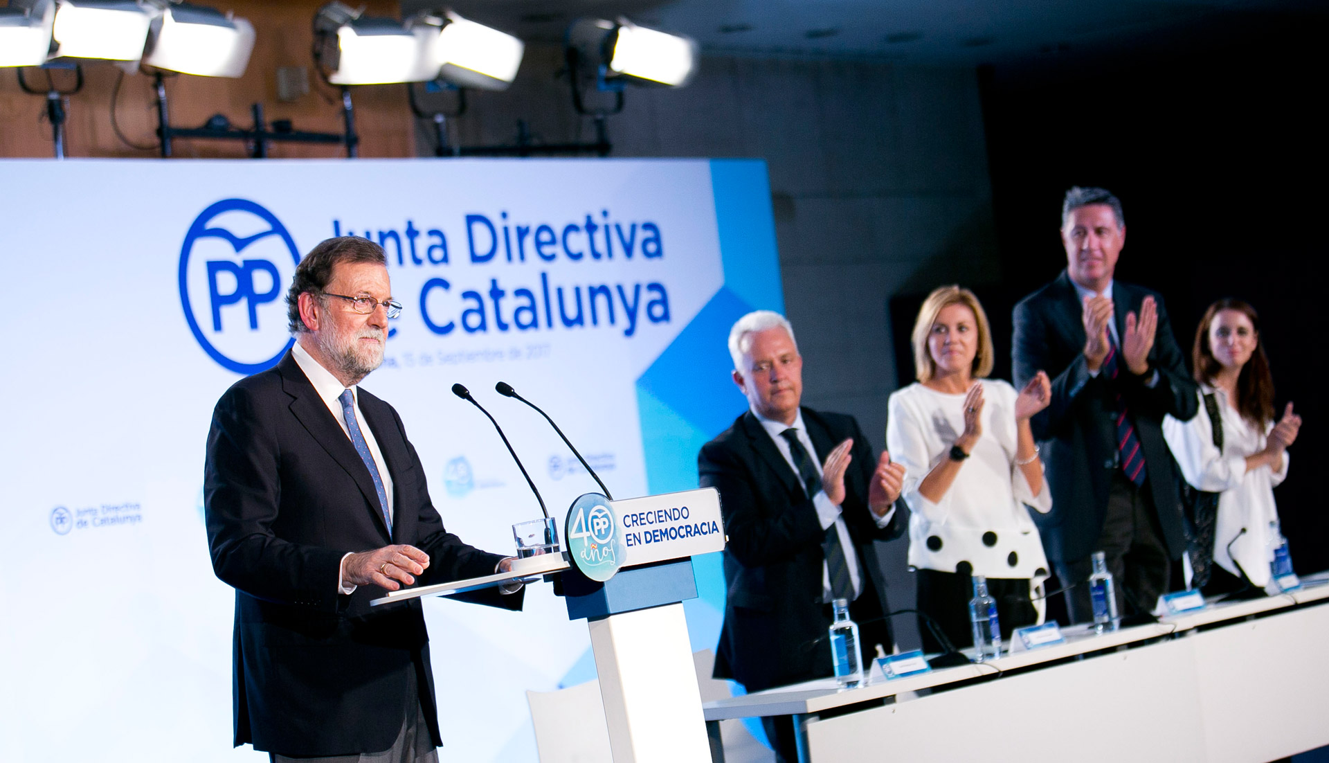 "Con serenidad y firmeza, no habrá referéndum el 1 de octubre", proclamó una vez más, y los suyos le aplaudieron. El PP catalán estaba deseando que Rajoy se trasladara a Cataluña. Primero, se convocó una escuela de verano en Salou, pero fue cancelada principalmente por motivos de seguridad. Finalmente, se organizó este viernes por la tarde una Junta Directiva, a la que acudieron cientos cargos del partido. Según la organización, alrededor de 600. Cuando el presidente citó a la Guardia Civil y alabó su gestión para frenar el golpe, la ovación fue enorme. "Necesitábamos que viniera", en palabras de un dirigente medio.