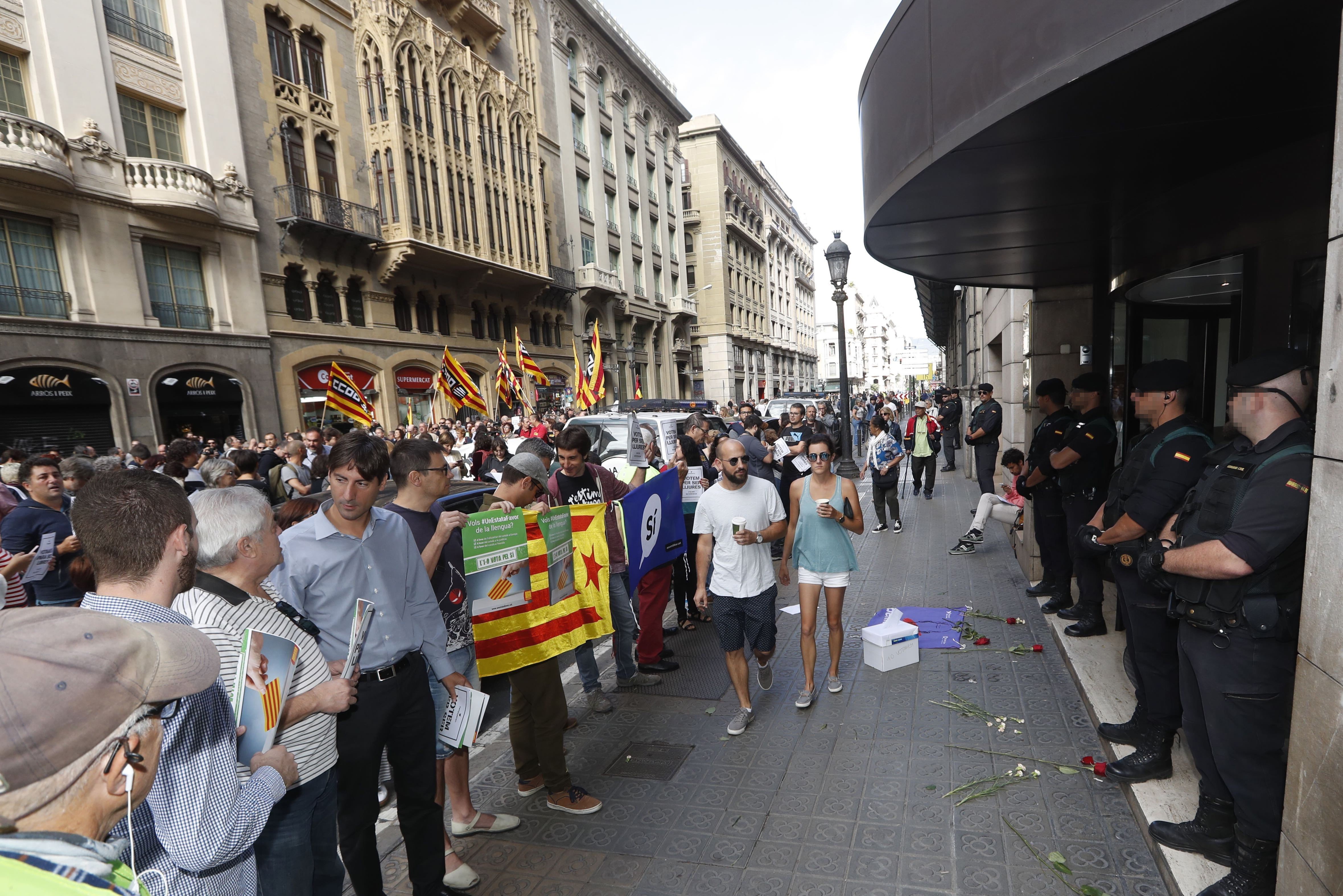 Entre los concentrados hay personas que llevan banderas independentistas y se están repartiendo carteles con el mensaje "Votemos para ser libres". A las 9 se ha cortado el sentido mar de la Rambla Catalunya con el mensaje: "Queremos votar", "fuera las fuerzas de ocupación" y un amplio cartel con el lema democracia en el suelo.