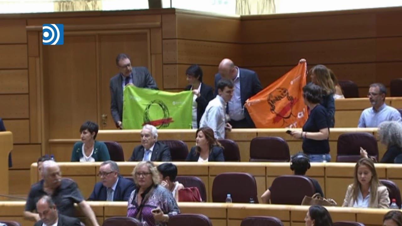 Los senadores catalanes han desplegado dos pancartas, una naranja y otra verde, con el dibujo de una mujer con la boca tapada y otra con el de un hombre en idéntica situación. Ambas pancartas son algunas de las diseñadas para reivindicar el referéndum ilegal del 1 de octubre en Cataluña.