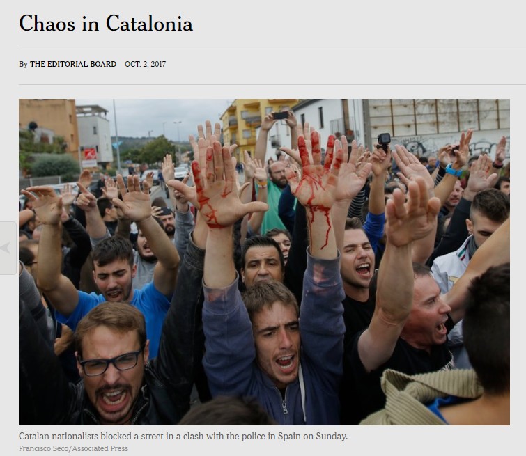 En su editorial, NYT señala en esta frase que "Cataluña hoy no puede quejarse de ser colonizada u oprimida". Considera el diario que la comunidad autónoma catalana no vive de facto una situación como la que están denunciando, de opresión, represión o asedio.