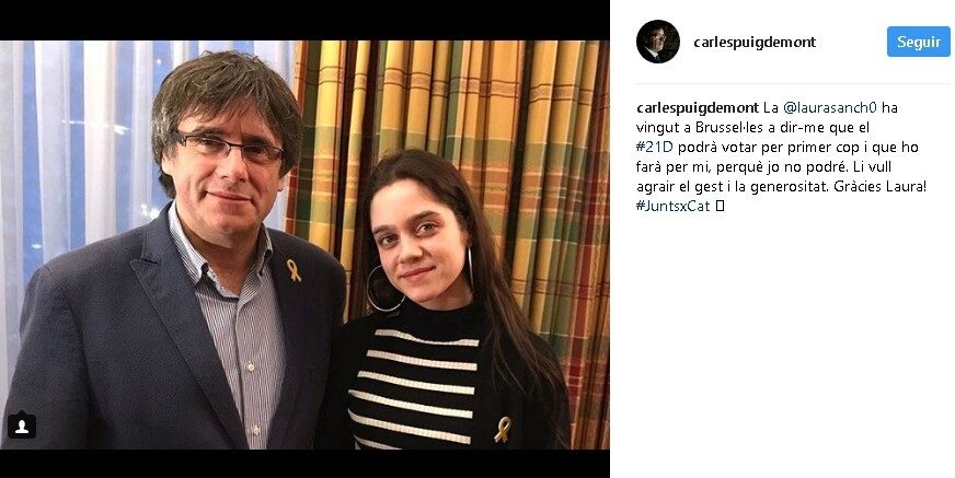 Se llama Laura Sancho, será la primera vez que vote y dice que ha sido ella quien se ha ofrecido "de manera generosa a ponerse a mi disposición". La chica viajó este fin de semana a Bruselas donde se reunió con él para formularle la propuesta ya que ella no pensaba participar en estas elecciones autonómicas. Ahora será esta chica quien introducirá el próximo jueves 21 de diciembre la papeleta de Puigdemont en la urna. Así lo ha anunciado el propio Puigdemont en su cuenta deInstragram.