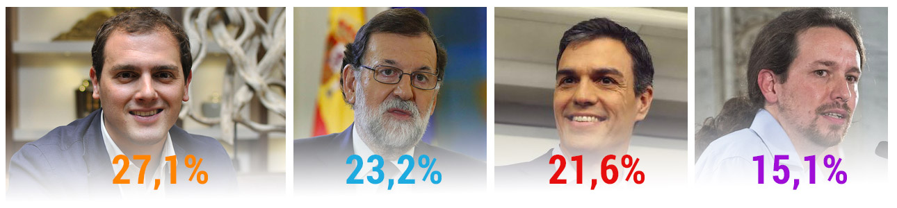 Un adelantamiento en toda regla porque, además, los de Rivera no sólo serían el partido más votado sino que abrirían un hueco bastante serio sobre sus perseguidores: mientras Ciudadanos estaría ya en un 27,1% de intención de voto el PP se quedaría casi cuatro puntos por detrás, en un 23,2% y el PSOE cerca de seis, con un 21,6%.