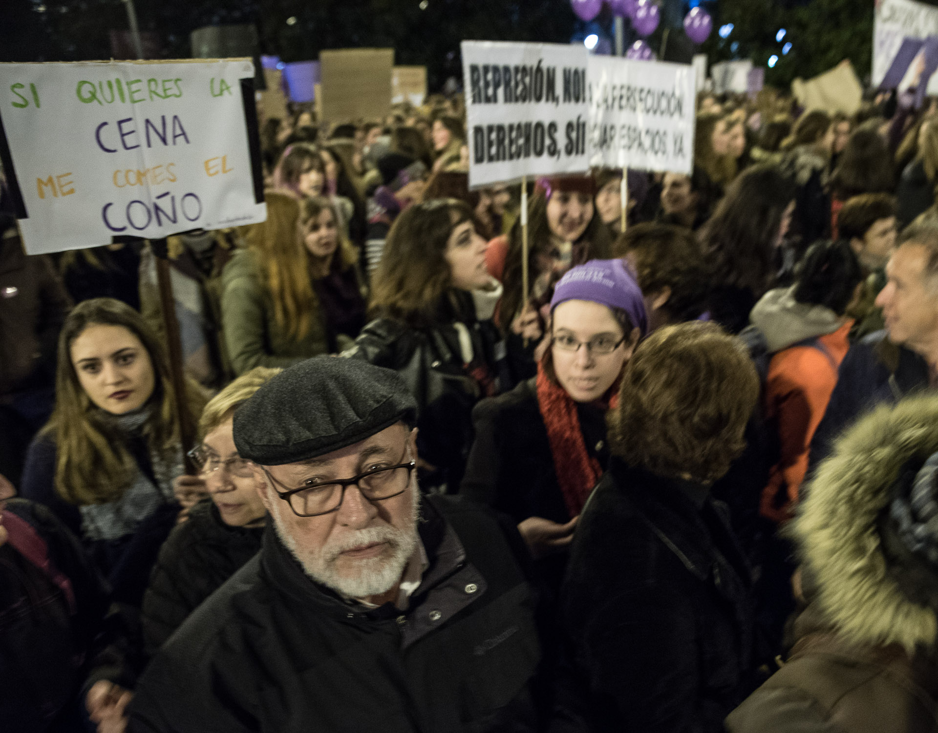 Un par de matrimonios de avanzada edad han sido expulsados con bastantes malos modos del "bloque no mixto" de la manifestación, una zona sólo para mujeres por si "alguna se siente intimidada por la presencia de hombres". Fíjense en la cara del hombre de la boina.
