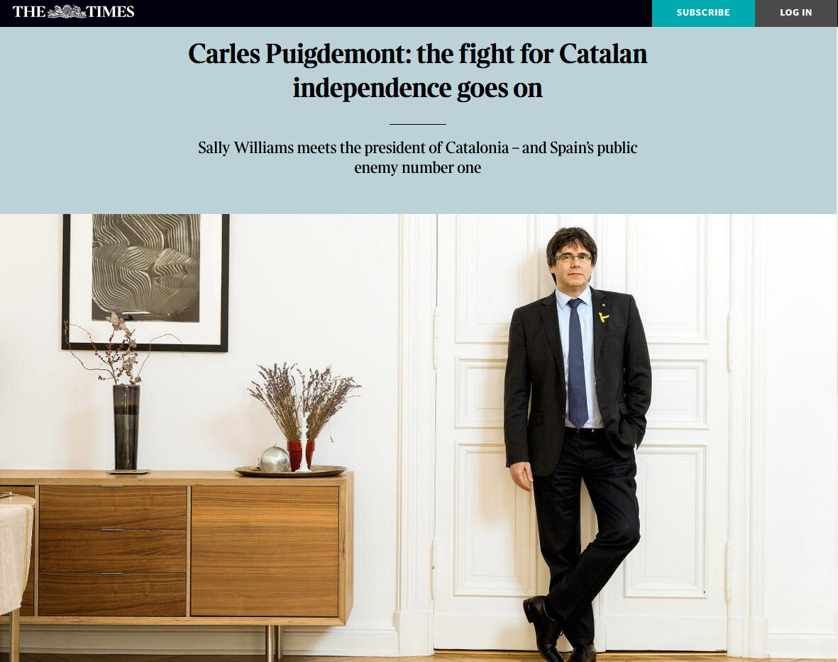 Sesión de masaje a Carles Puigdemont en el suplemento del The Times, que presenta al fugado como un simpático y cercano político convertido en el "enemigo público número uno de España". En el amplio reportaje dedicado a Puigdemont se mezclan las declaraciones de tono personal con la descripción de España a cargo de la autora del texto, Sally Williams, como un país anclado en el franquismo y que esquilma a los catalanes.
