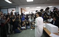 Periodistas en la sede en la que votó Santamaría. | EFE El PP prohíbe entrar a los periodistas a las sedes donde no votan los candidatos Daniel Muñoz