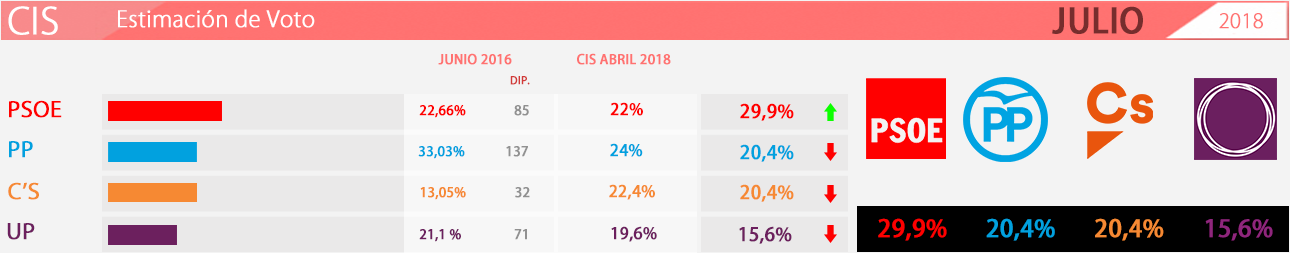 El PSOE sería el partido más votado según el barómetro del CIS de julio que se ha hecho público este jueves. La llegada de Sánchez a Moncloa dispara a los socialistas, que pasarían del 22% en abril a un 29,9%.