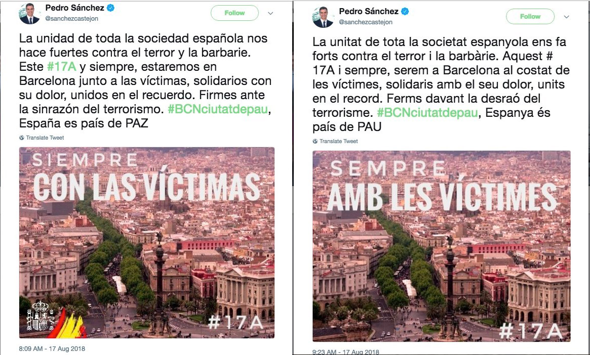 El presidente del Gobierno, Pedro Sánchez, ha publicado en su cuenta de Twitter dos mensajes aparentemente iguales en español y catalán, eliminando en el segundo el escudo y la bandera de España. Algo después, ha rectificado.