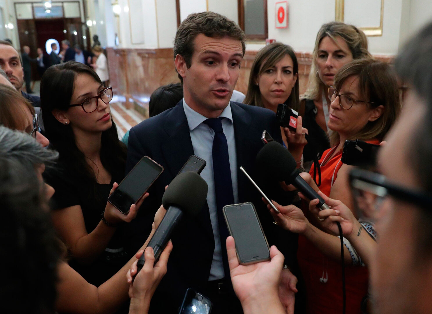 Ya en declaraciones a los periodistas en los pasillos de la Cámara, y tras 24 horas de silencio, Casado fijó oficialmente postura ante la posibilidad de que Torra acuda a las Cortes. Rechazó que pudiera comparecer "por la puerta de atrás" y exigió que sea en sesión plenaria y con votación, como ya sucedió con el Plan Ibarretxe. Esto es, rechazó frontalmente la posibilidad de que acudiera a la comisión territorial, como planteó el PSOE.