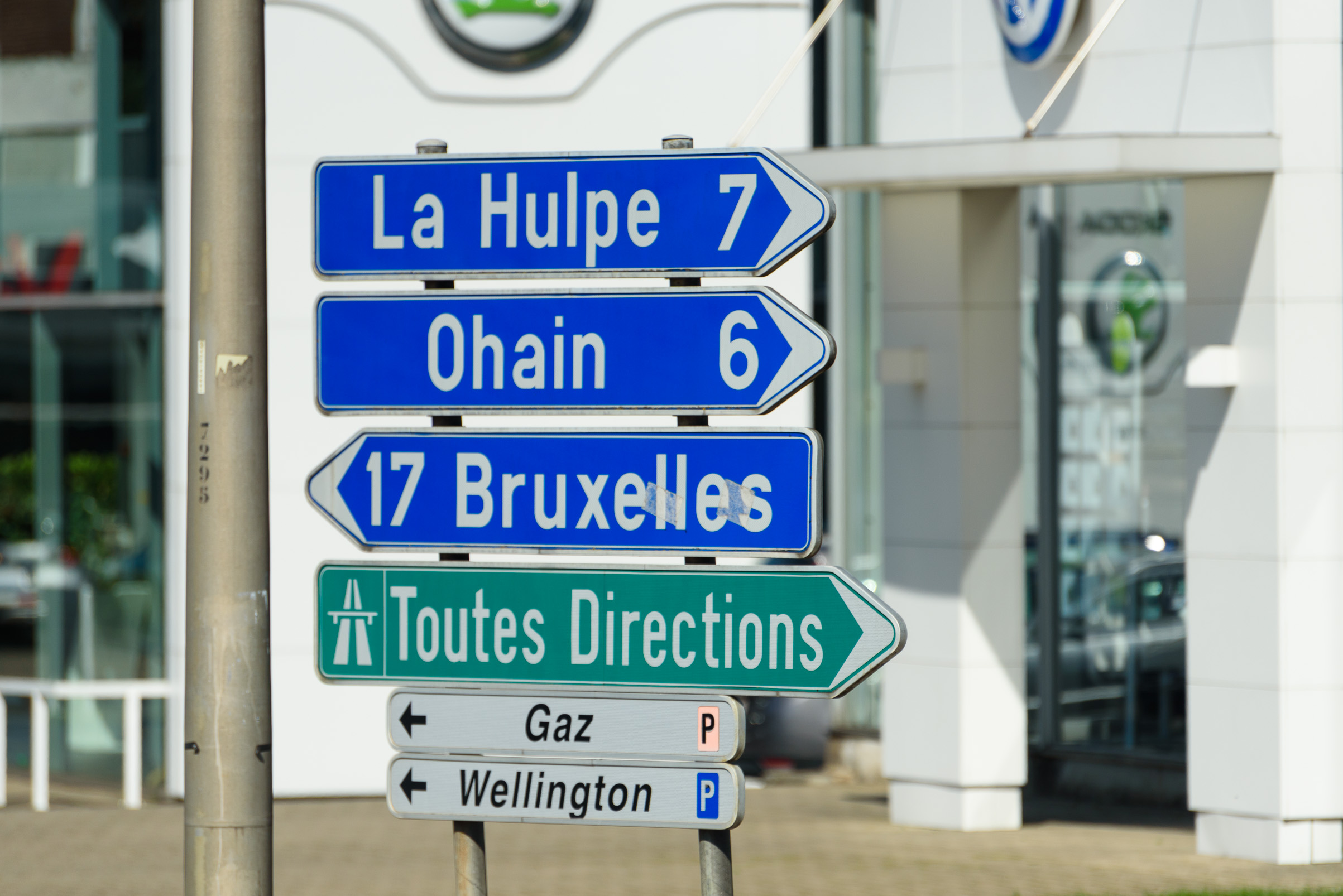 Una señal indica los kilómetros de distancia a Bruselas, capital de Bélgica y de Europa.