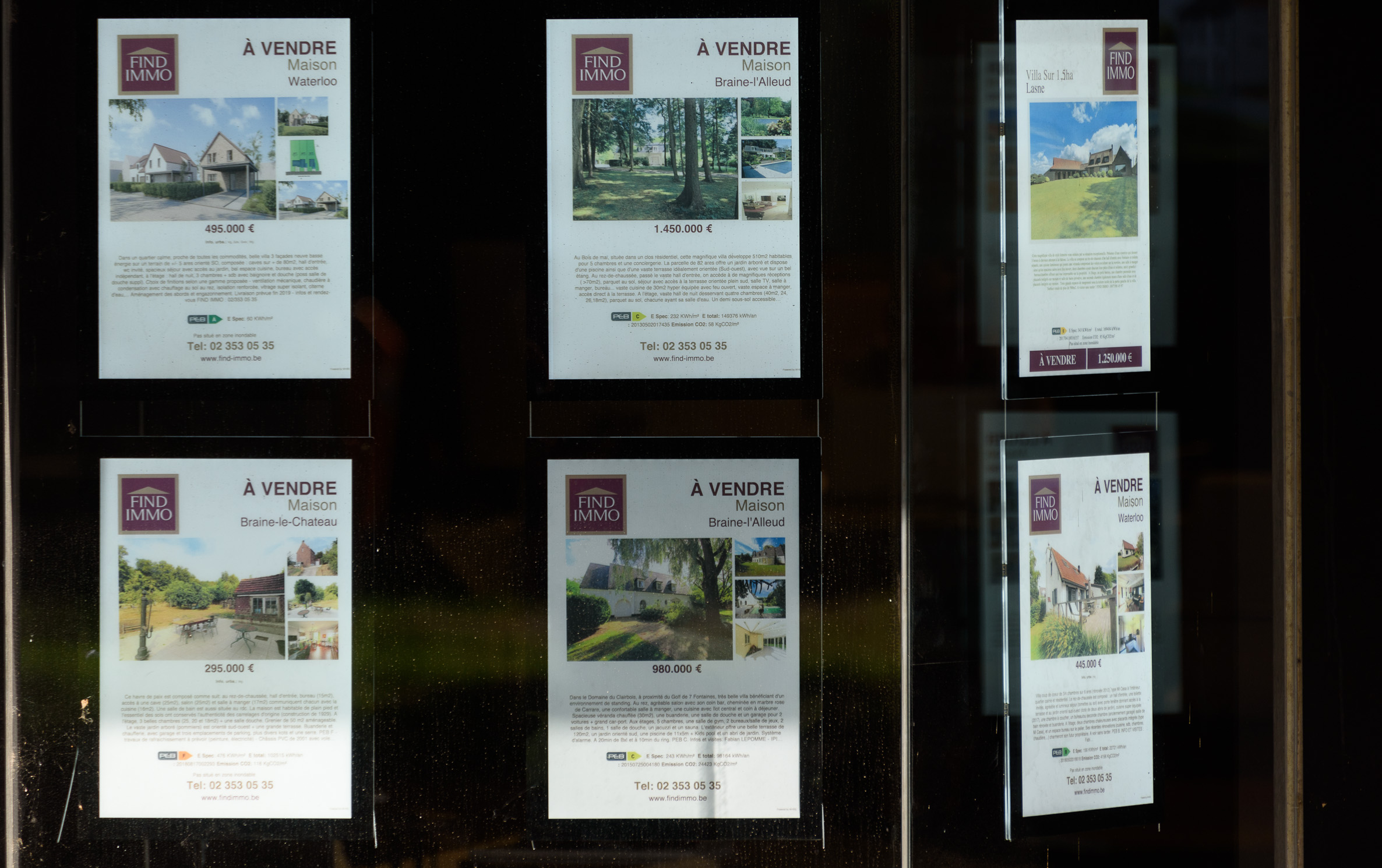 Los carteles de una de las inmobiliarias de la zona comercial de la ciudad de Waterloo.