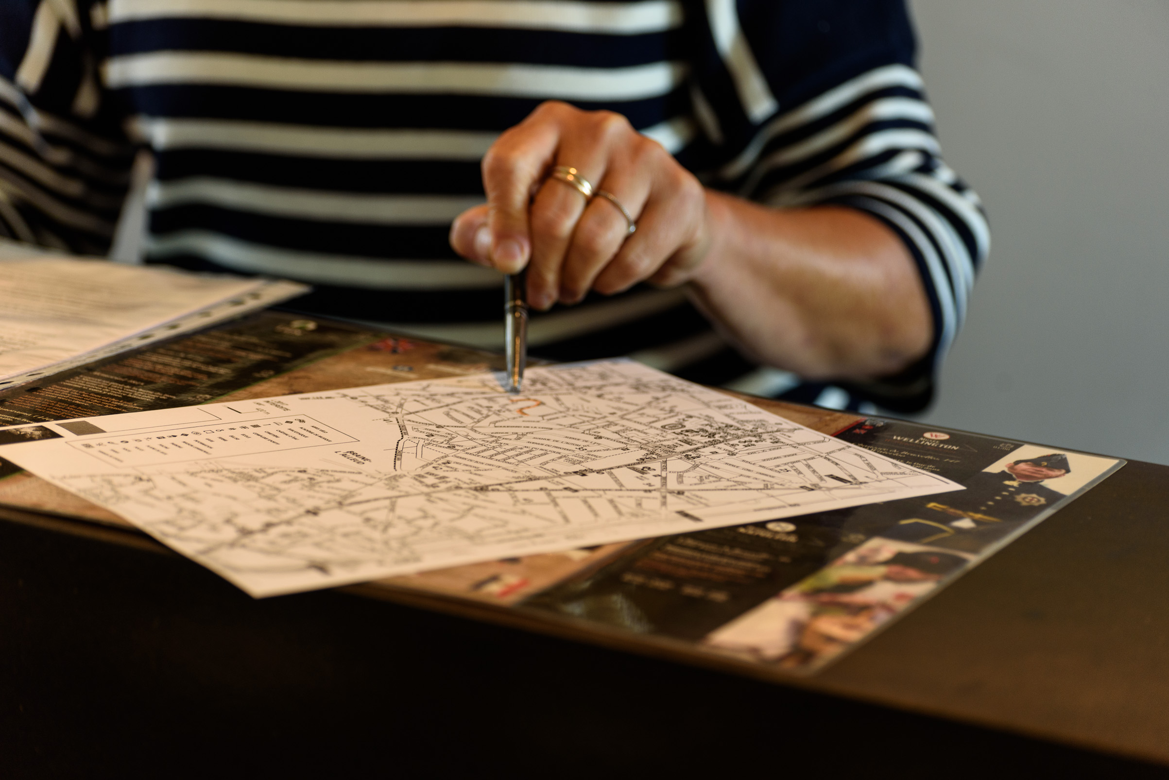 La responsable de la oficina de turismo de la localidad de Waterloo indica con un bolígrafo el lugar exacto, marcado en rojo, donde se asienta la mansión de Puigdemont.