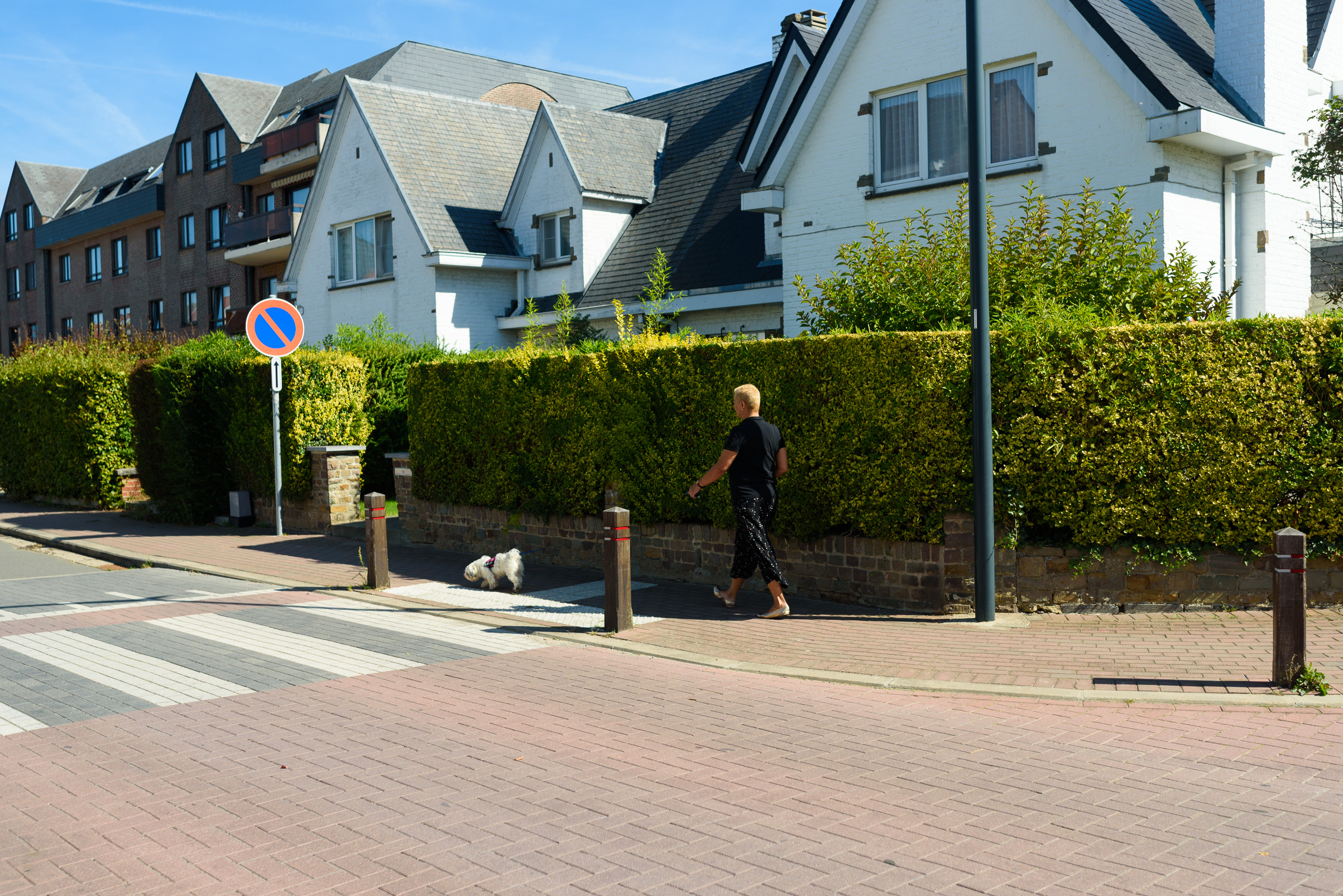 Una mujer pasea a un perro en las inmediaciones del barrio donde vive Puigdemont.