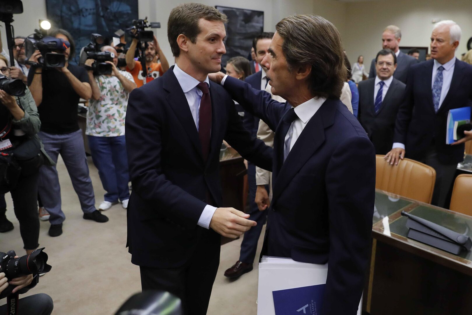 Pablo Casado recuperó definitivamente a José María Aznar como referente del PP. Atrás quedaron los tiempos de Mariano Rajoy, cuando era tachado de "desleal" y se enfatizaba que era un afiliado más sin influencia en Génova13. El nuevo líder de la formación lo arropó en su vuelta al Congreso, y ensalzó su legado después de que se enfrentara durante cerca de cinco horas a las preguntas de los partidos sobre la presunta financiación ilegal durante el aznarismo. "Ha estado enorme", zanjaron en Génova.