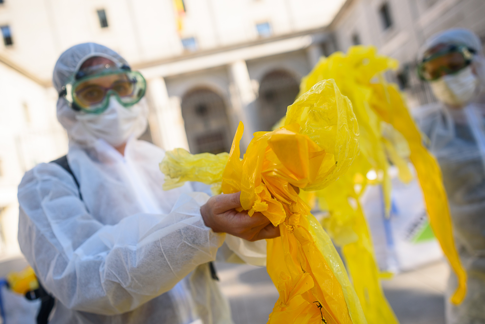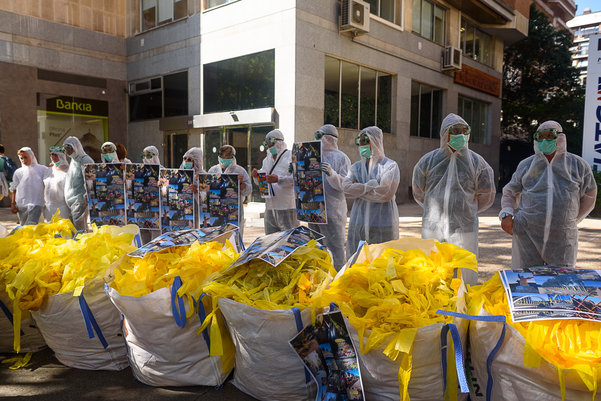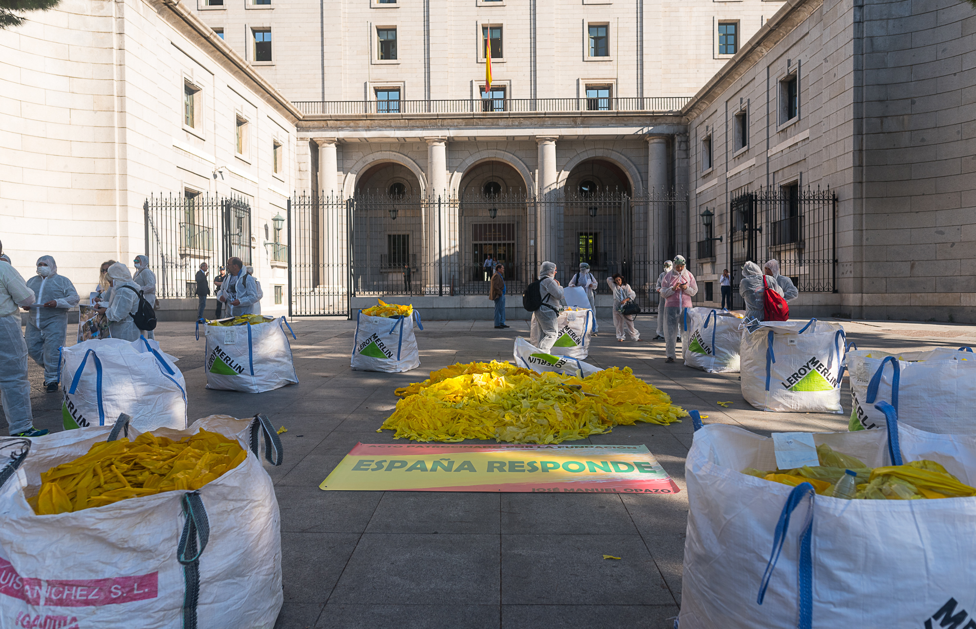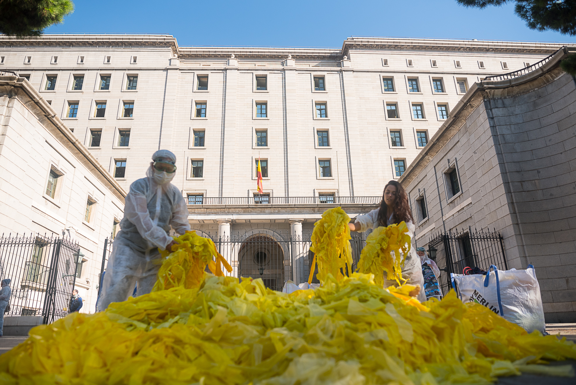 Las denominadas \'brigadas de limpieza\' han acudido a la sede del Ministerio de Transición Ecológica, en Madrid, para mostrar un pequeño ejemplo de las toneladas de plástico amarillo que limpian en determinadas zonas de Cataluña.
