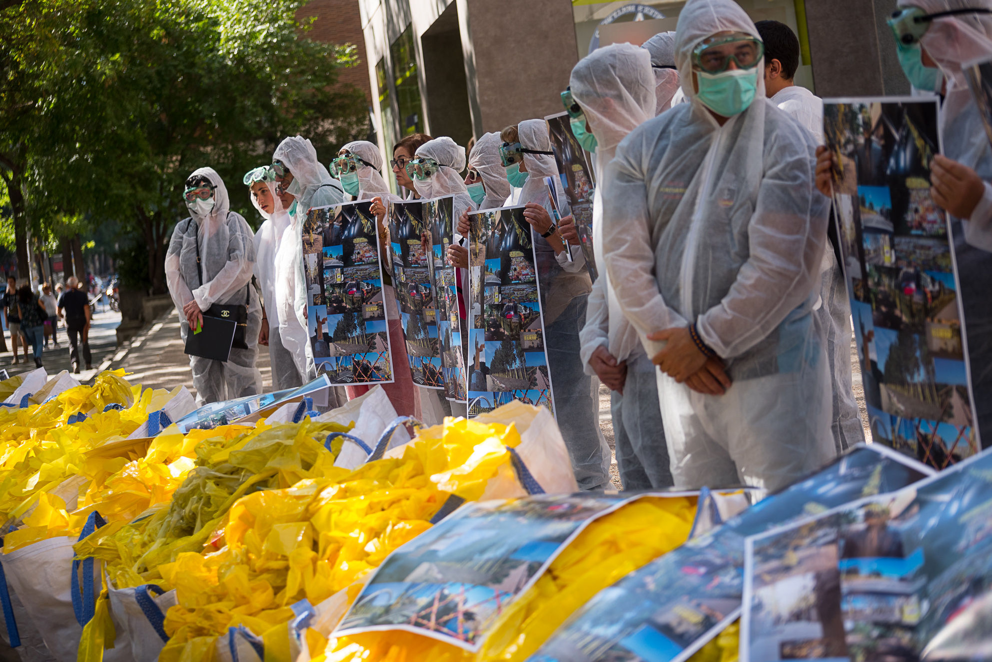 Decenas de personas que forman parte de las llamadas \'brigadas de limpieza\' han acudido a la sede de Green Peace, en Madrid, para mostrar un pequeño ejemplo de las toneladas de plástico amarillo que limpian en determinadas zonas de Cataluña.
