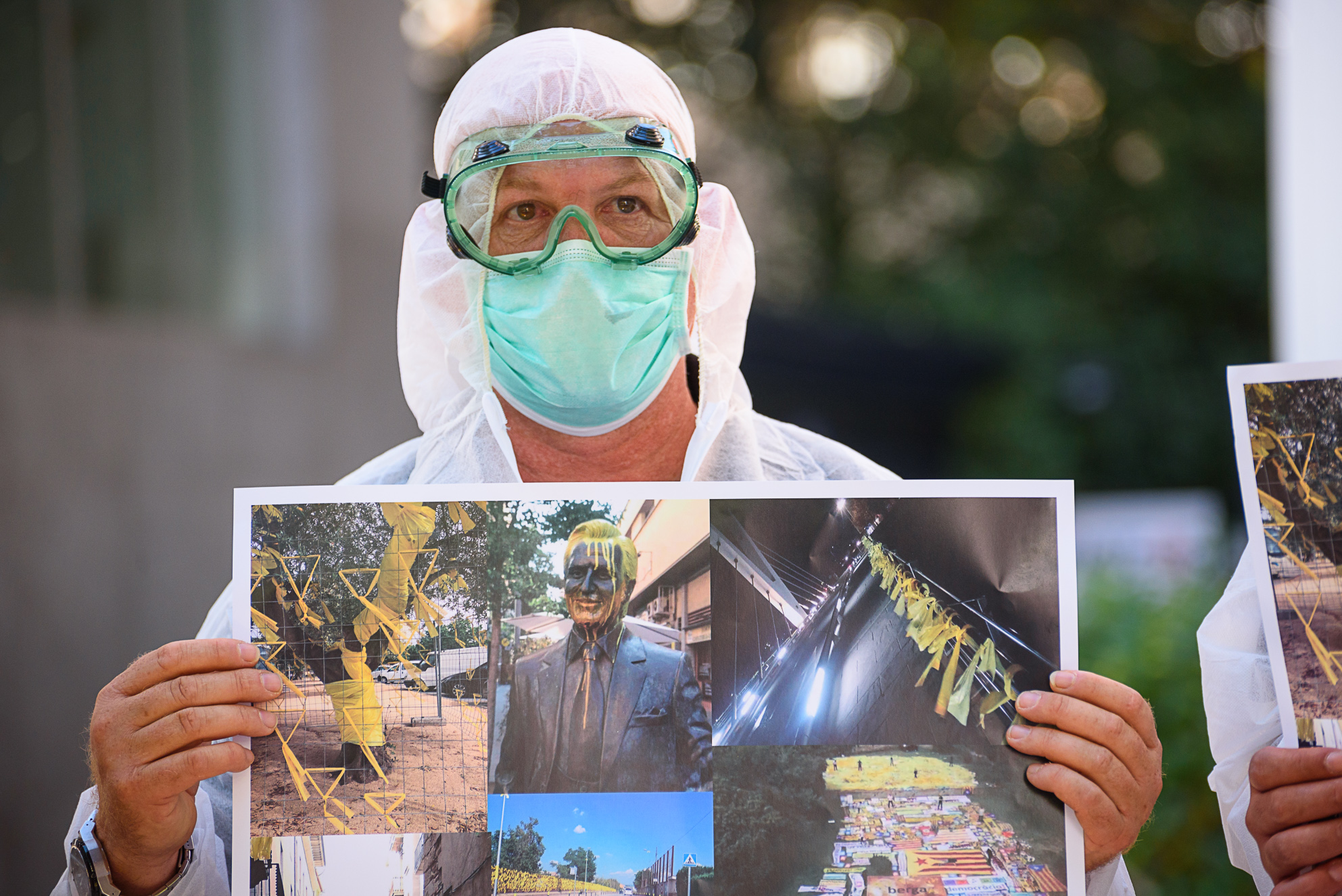 Varios voluntarios de las brigadas de limpieza catalanas están mostrando ante el Ministerio para la Transición Ecológica y la sede de Green Peace en Madrid, miles de los lazos amarillos que han retirado en las últimas semanas en Cataluña.