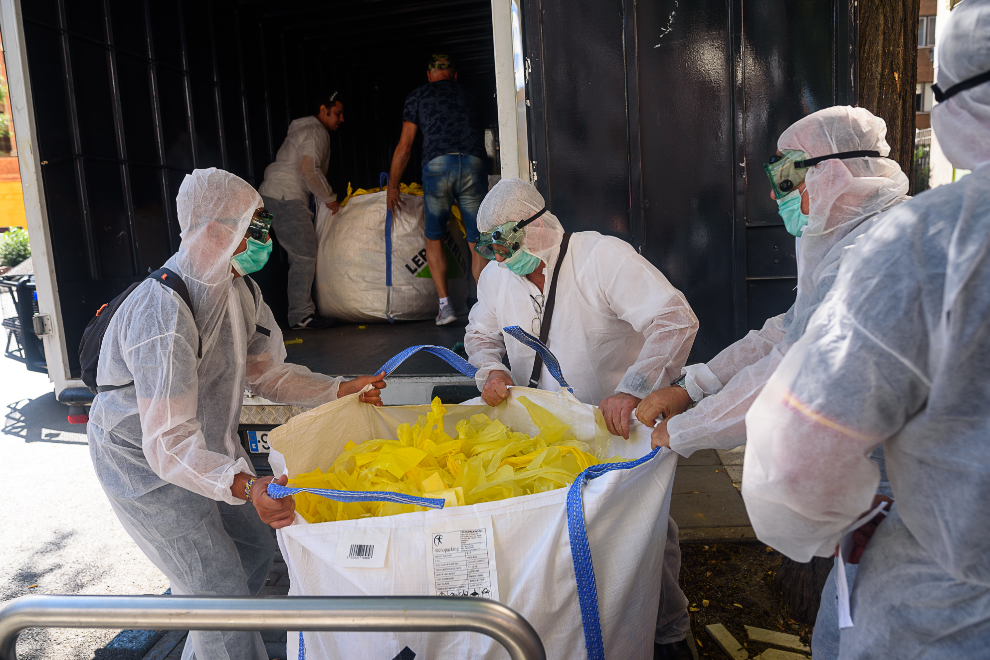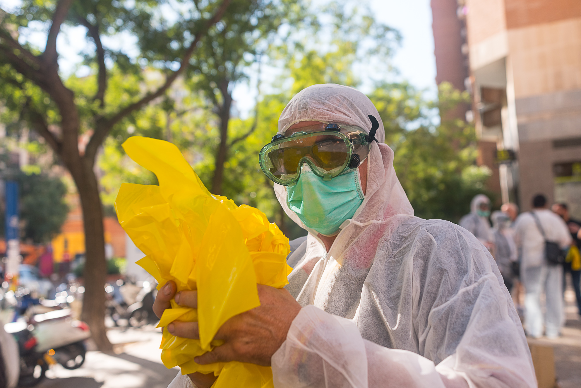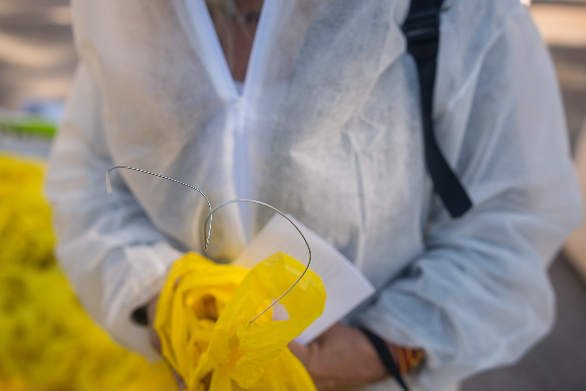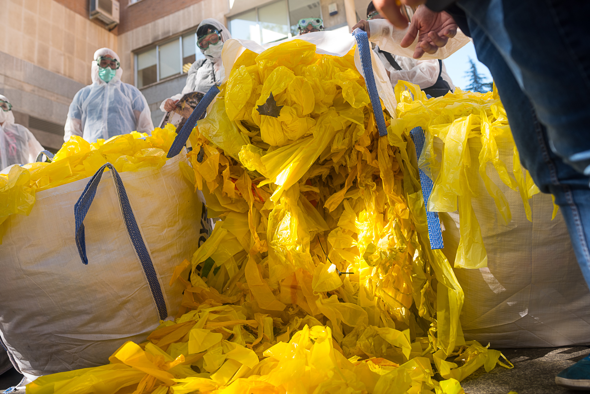 Uno de los ciudadanos ataviado con su característico mono blanco, gafas y mascarilla, sujeta un puñado de plásticos amarillos.
