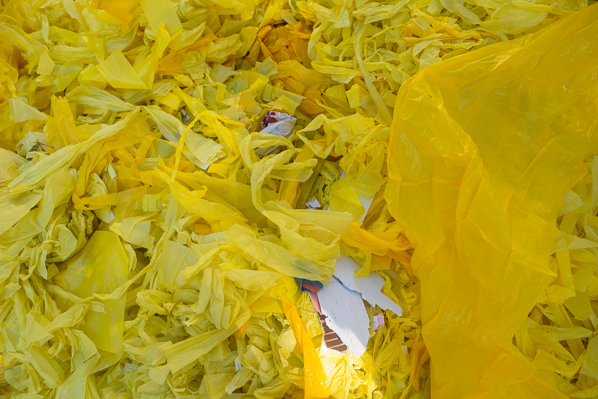 Miles de plásticos amarillos, utilizados por los independentistas Cataluña a modo de lazo, se han mostrado en Madrid para mostrar una pequeña cantidad de las toneladas de estas tiras de plástico se retira de las calles catalanas.