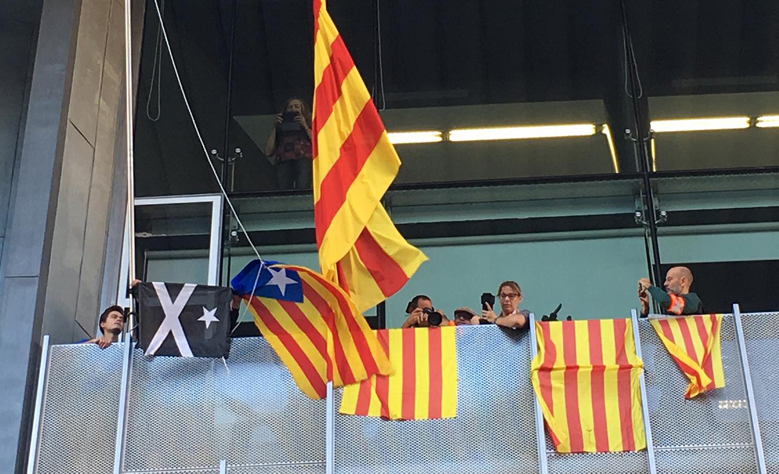 Los independentistas toman la Delegación de Gobierno catalán en Gerona y exhiben desde sus balcones una bandera estrellada.