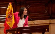 Inés Arrimadas luce la bandera de España en el 'Parlament' LD/Agencias La líder de Ciudadanos en Cataluña ha terminado su intervención en el Parlamento de Cataluña luciendo una bandera Española.