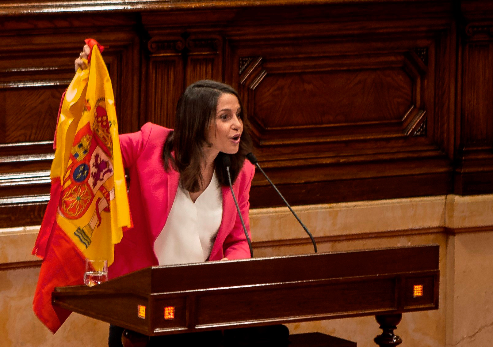La líder de Ciudadanos en Cataluña ha terminado su intervención en el Parlamento de Cataluña luciendo una bandera Española.