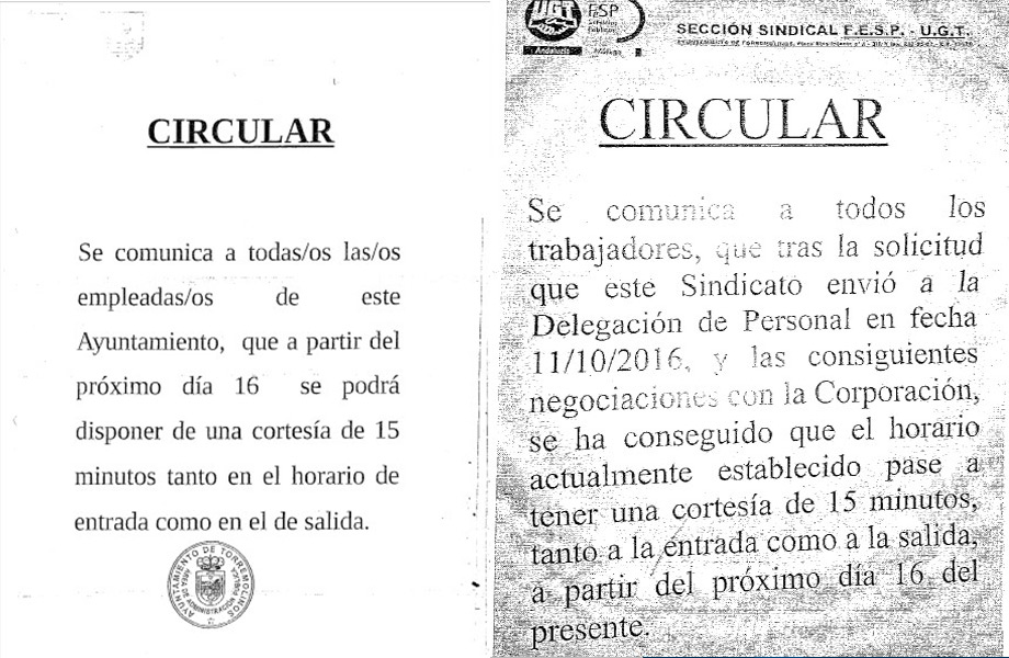 De la circular se hizo eco la Unión General de Trabajadores del Ayuntamiento de Torremolinos que comunicó a los trabajadores municipales que "tras la solicitud que este sindicato envió a la Delegación de Personal el pasado 11 de octubre de 2016 y las consiguientes negociaciones con la Corporación, se ha conseguido que el horario actualmente establecido pase a tener una cortesía de 15 minutos, tanto a la entrada como a la salida, a partir del próximo día 16 del presente" (enero de 2017), día referido en la Circular del Área de Administración Pública.