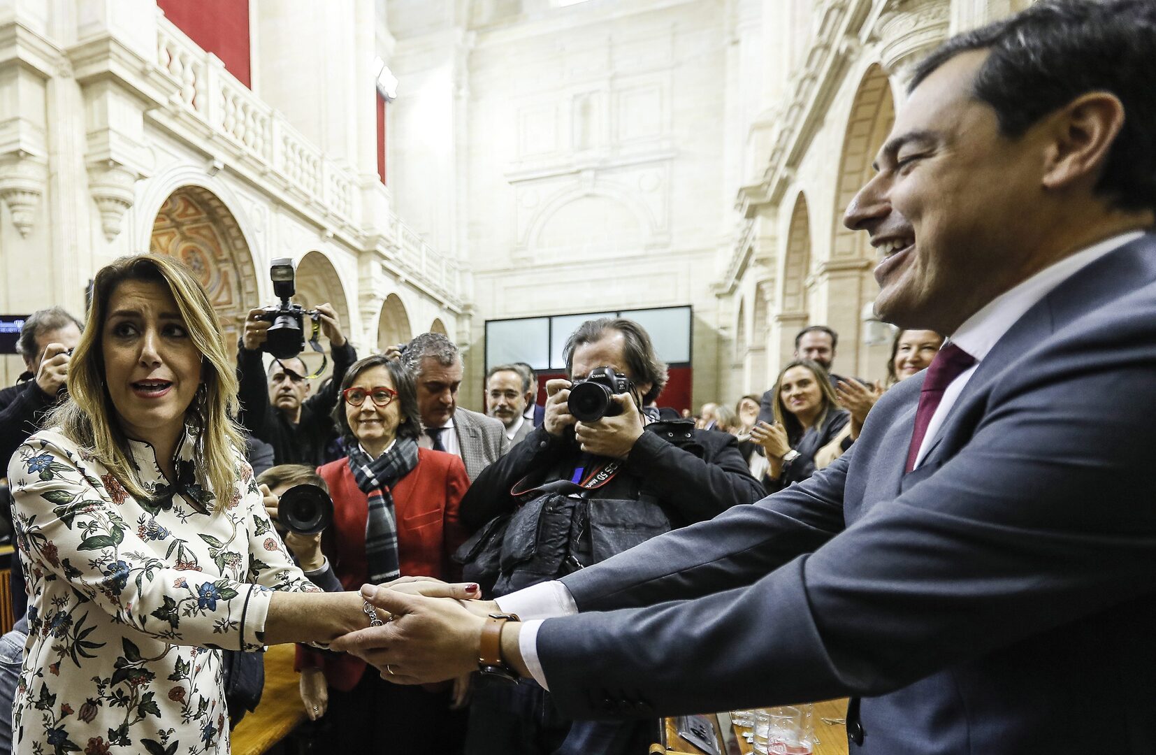 "Se abre una etapa ilusionante y apasionante", en palabras de Moreno. Pero no le será fácil. "Suárez enterró el franquismo y usted va a entrar en el gobierno con sus herederos", le espetó Susana Díaz, que aseguró que será la líder de oposición. "Usted va a formar un gobierno de cambio, pero de cambio a peor, que se va a sustentar en un bloque de involución y tienen la sartén por el mango sólo con esos votos de extrema derecha", añadió. El líder del PP andaluz, contundente, puso en duda que vaya a seguir mucho tiempo al frente de la bancada socialista. Al término de la votación, la socialista felicitó a su sucesor.