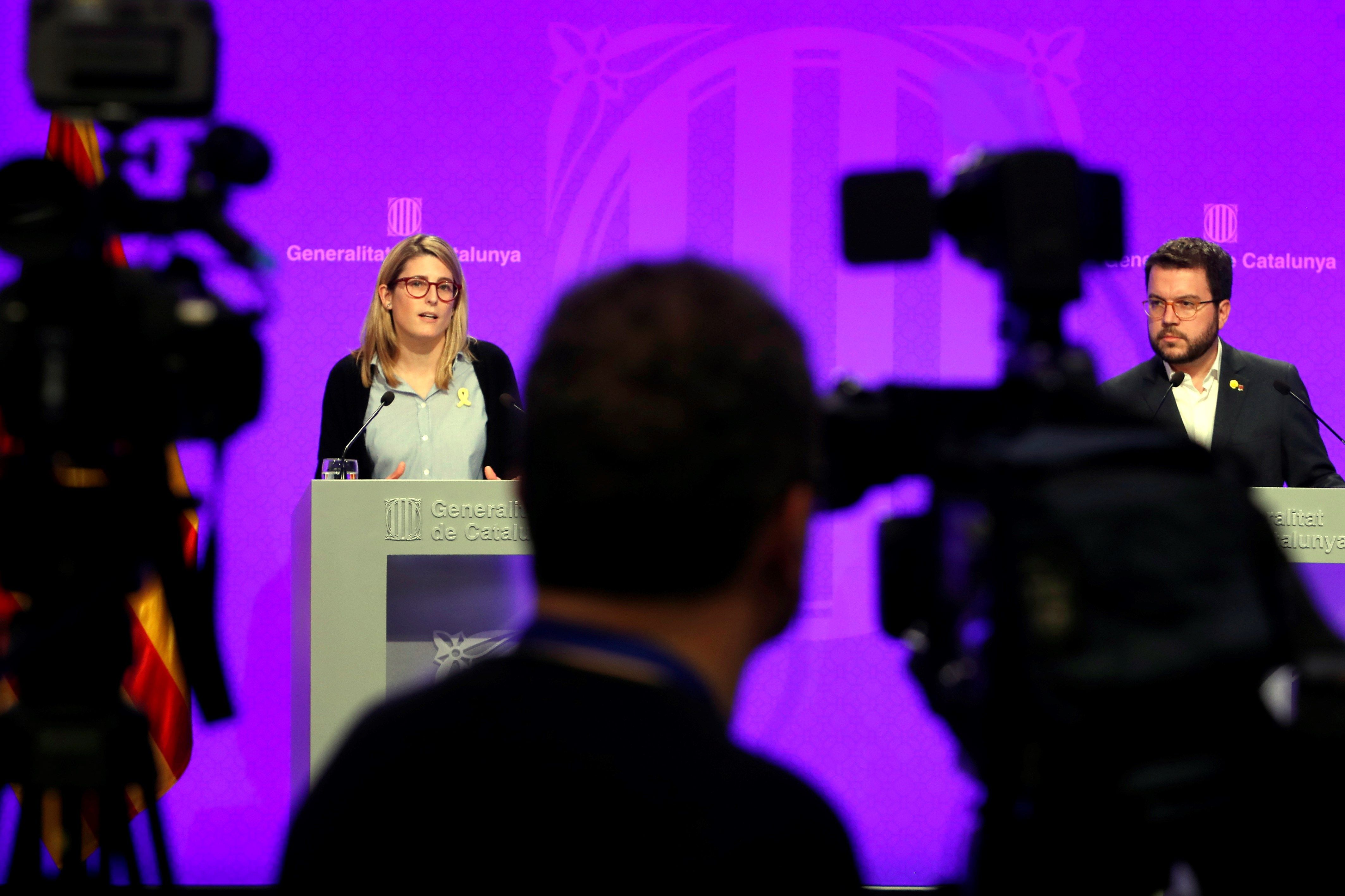 Sorpresa absoluta en la sede de la Generalidad tras la comparecencia de la vicepresidenta del Gobierno Carmen Calvo dando por rotas las relaciones con el separatismo. El vicepresidente catalán, Pere Aragonès y la portavoz Elsa Artadi han salido a responder al Gobierno que ellos no se han movido de dónde estaban: de la exigencia del reconocimiento del derecho a la autodeterminación -objetivo principal para las mesas de diálogo- y que su posición es la misma que hace dos días cuando la vicepresidenta del Gobierno también compareció en el Palacio de La Moncloa para normalizar la figura del relator ante las críticas de algunos barones socialistas.