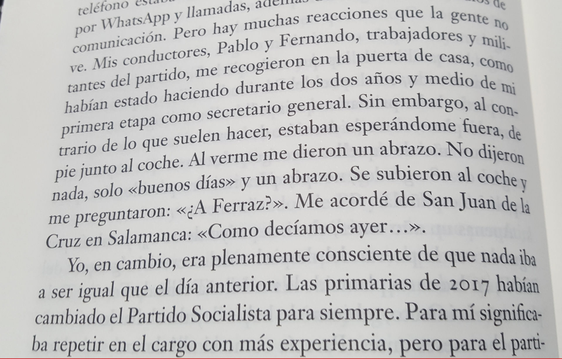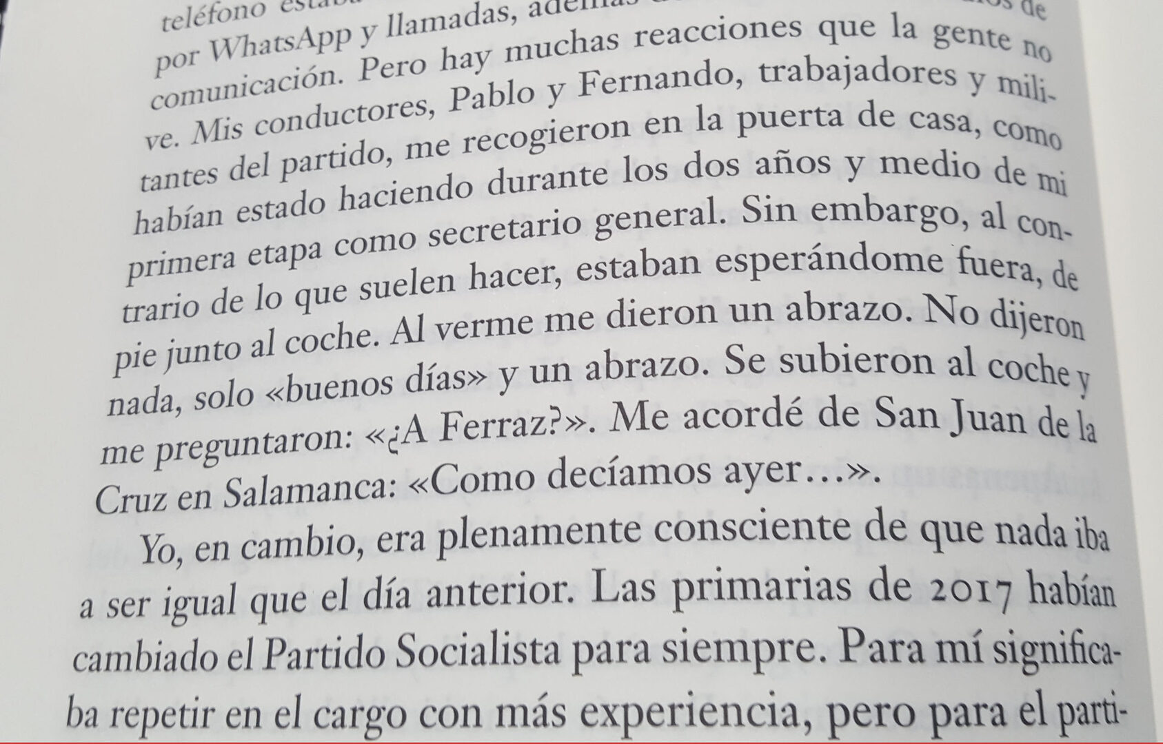 En ella Pedro Sánchez está narrando sus sentimientos al imponerse en las segundas primarias del PSOE de las que salió victorioso y explica que al volver a Ferraz "me acordé de San Juan de la Cruz en Salamanca: 'Como decíamos ayer'".