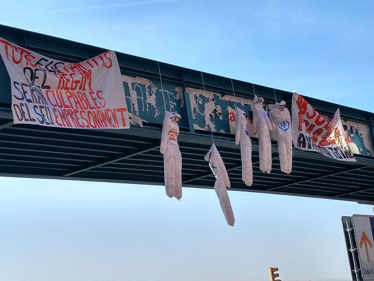 Junto a dos carteles en los que se pide la absolución de los separatistas encausados y se califica de "culpables" a "los partidos del régimen" por el encarcelamiento de líderes golpistas, cinco muñecos ahorcados, tres de ellos con los logos de Ciudadanos, Vox y PP.