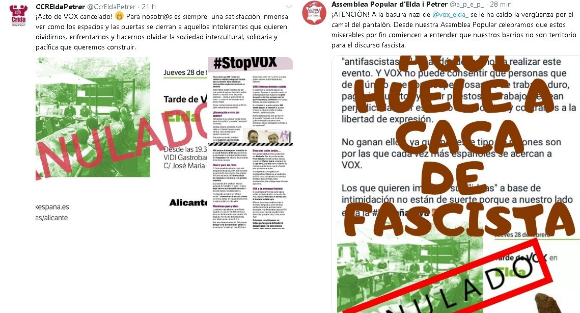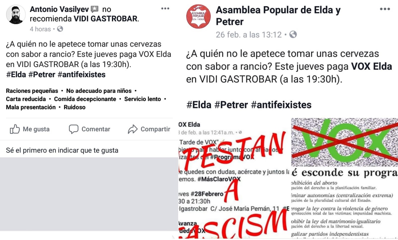 Al igual que ocurriera recientemente en Segovia, donde varios establecimientos sufrieron el acoso de radicales de izquierda por mostrar su simpatía hacia Vox, el dueño de un local en Elda, Alicante, se ha visto obligado a cancelar un acto que el partido iba a celebrar este jueves, por las coacciones que estaba sufriendo.