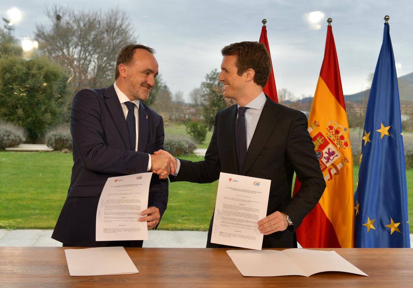 Casado firmó este miércoles en Pamplona un acuerdo marco de colaboración política de institucional entre PP y UPN para las próximas elecciones generales, europeas, autonómicas y municipales.
