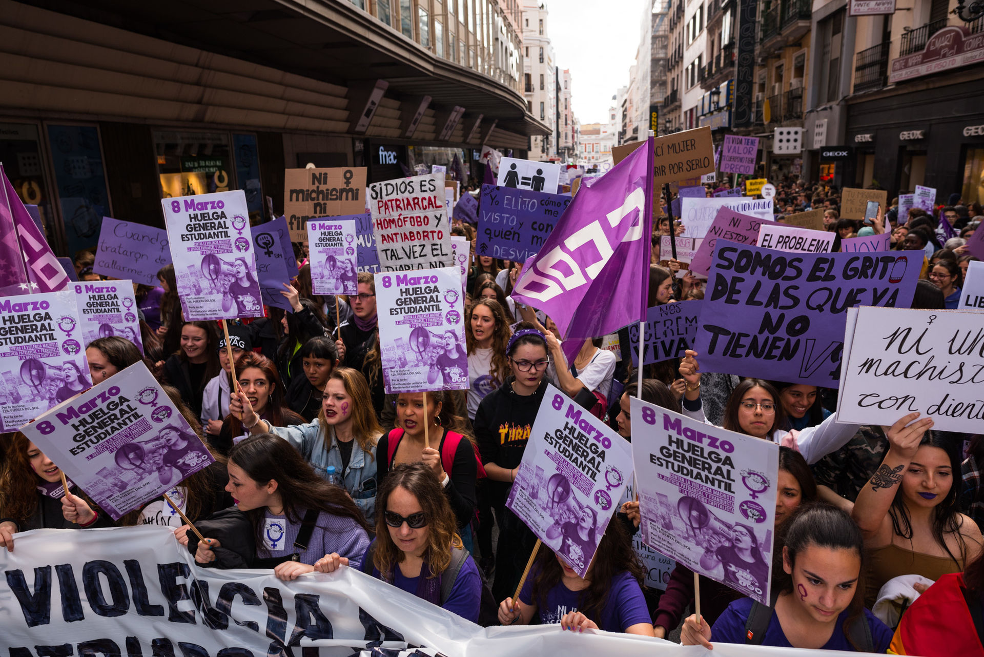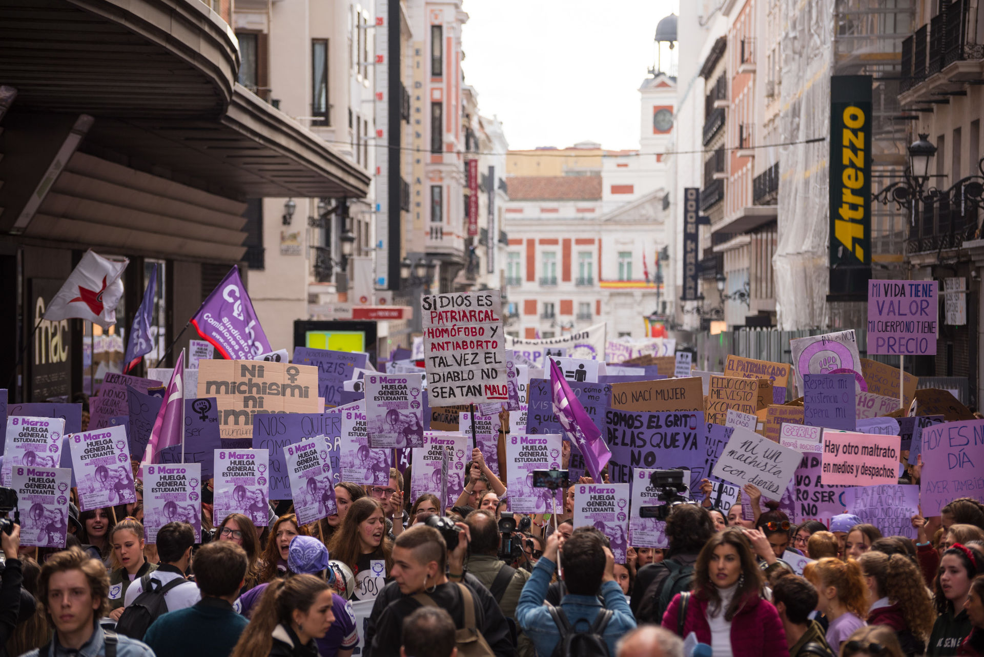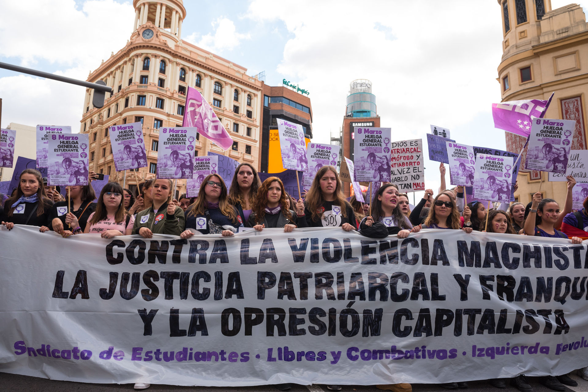 Una multitud de estudiantes feministas se han manifestado en Madrid, durante la jornada de huelga este 8 de marzo, entre la Puerta del Sol y el Ministerio de Justicia, portando pancartas del sindicato CCOO y otros mensajes reivindicativos.