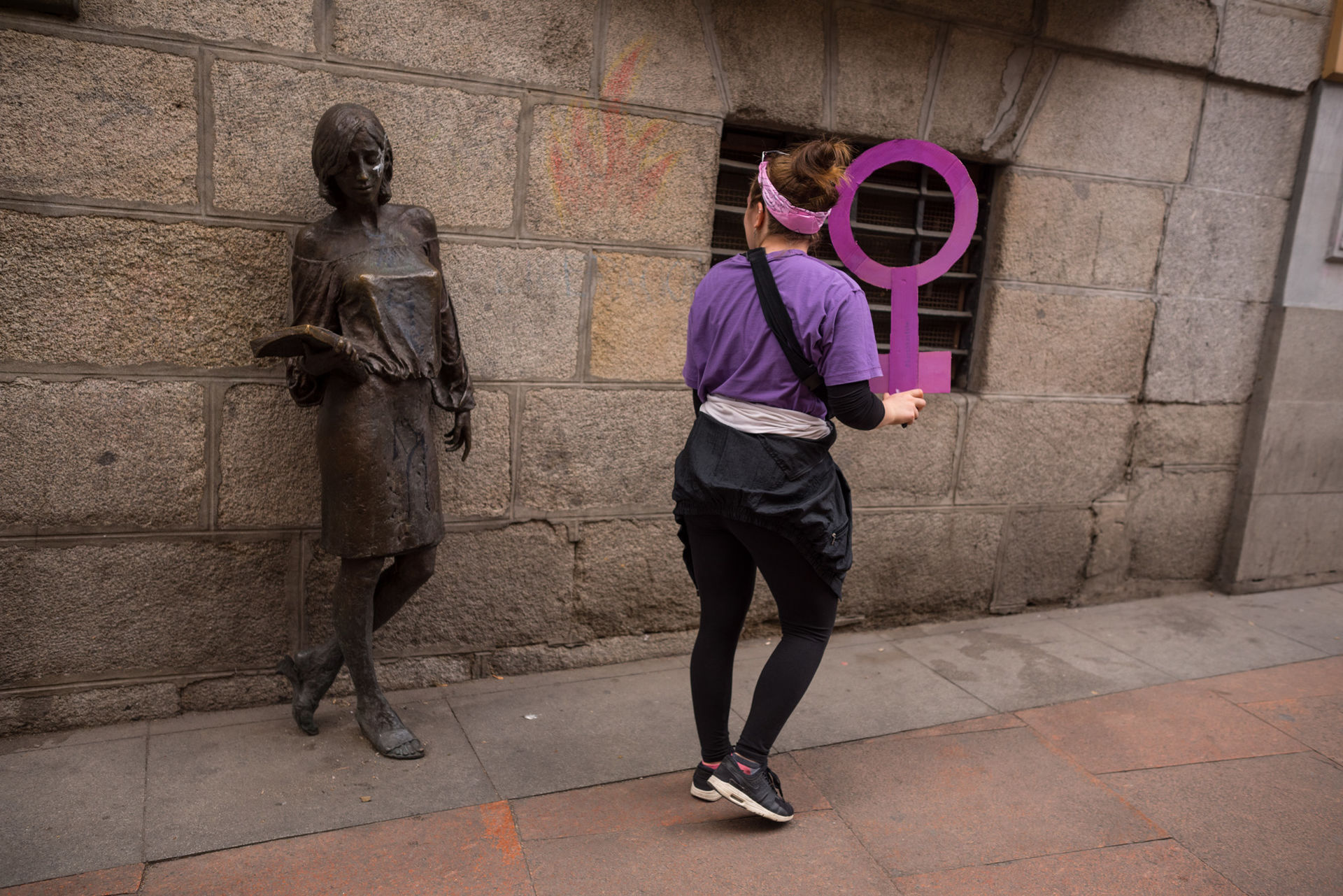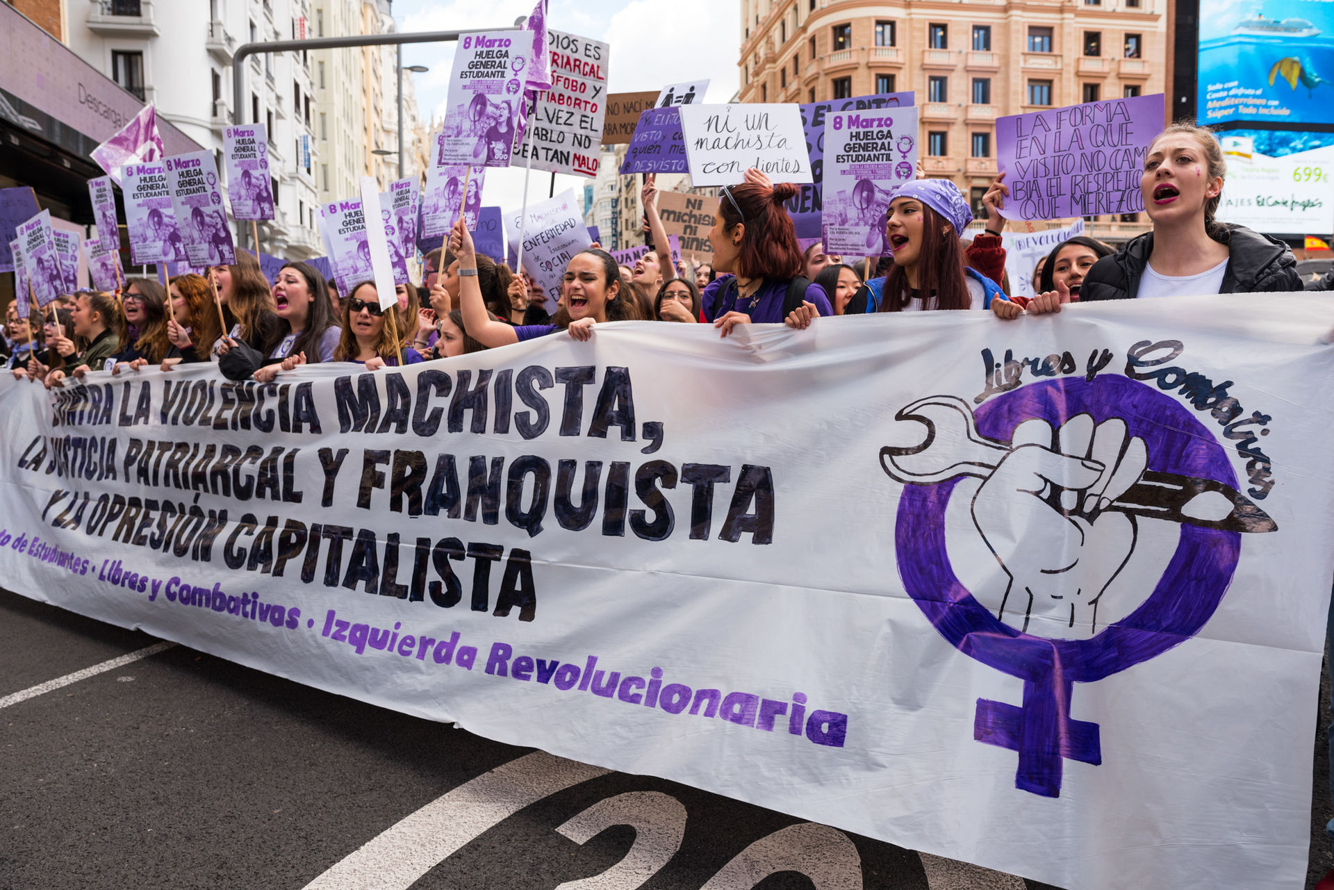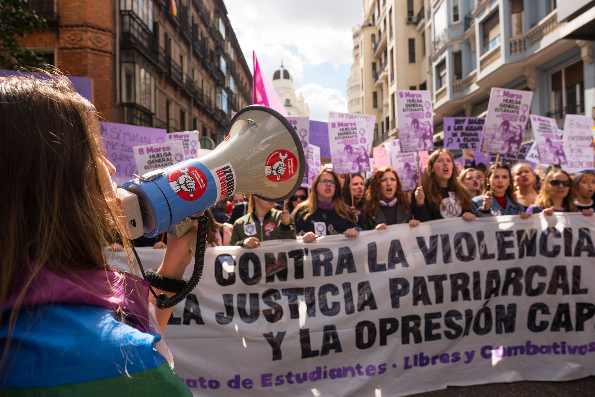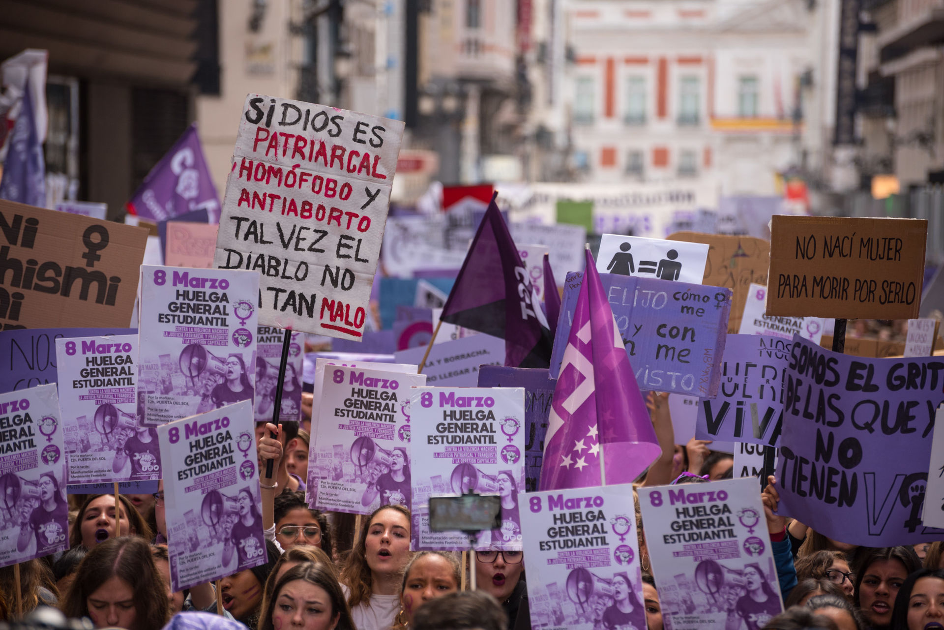 Una multitud de estudiantes feministas se han manifestado en Madrid, durante la jornada de huelga este 8 de marzo, entre la Puerta del Sol y el Ministerio de Justicia, portando pancartas del sindicato CCOO y otros mensajes reivindicativos.