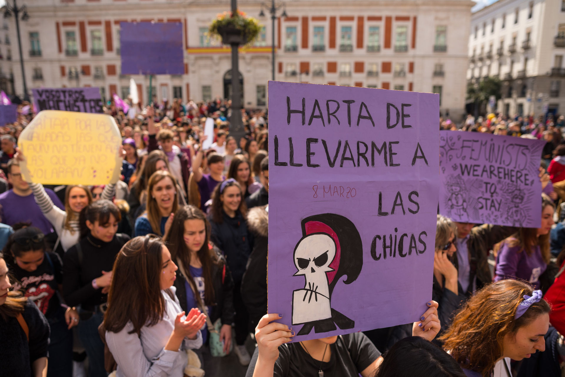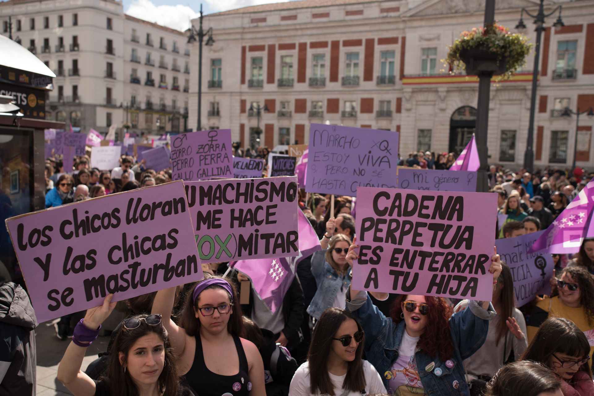 Una multitud de estudiantes feministas se han manifestado durante la jornada de huelga este 8 de marzo, entre la Puerta del Sol y el Ministerio de Justicia portando pancartas del sindicato CCOO y otros mensajes reivindicativos.