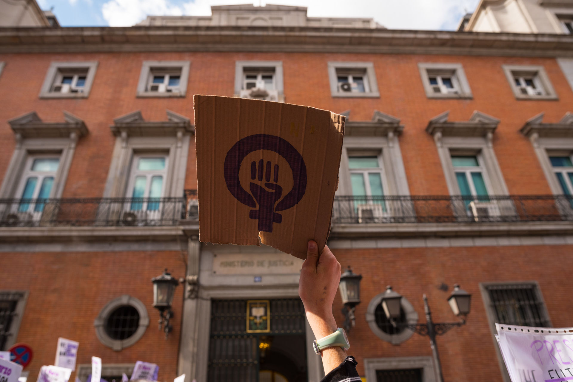 Una manifestante porta el símbolo de la mujer con un puño frente al Ministerio de Justicia.
