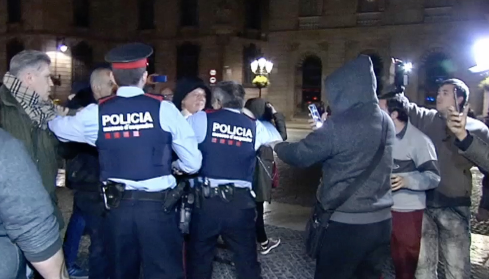 Un grupo de ciudadanos se encara contra los Mossos cuando estos impiden que se retiren los lazos amarillos del palacio de la Generalidad.
