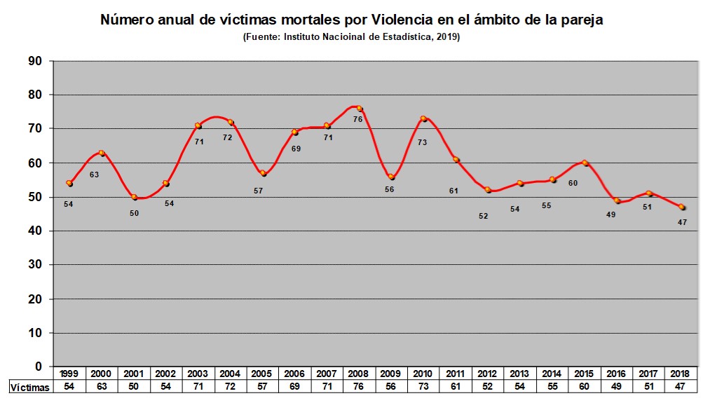 Por último, ¿ha logrado la Ley de Violencia de Género reducir el número de mujeres asesinadas a manos de sus parejas o exparejas? Las víctimas mortales rondan las 1.200 desde 1999 hasta 2018, lo que supone una media de 59,7 al año, equivalente a una ratio de 2,9 víctimas por cada millón de mujeres mayores de 14 años, una de las más bajas de Europa.