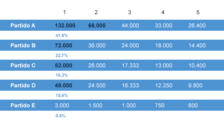Los votos de los partidos se ordenan en una tabla por columnas con los cocientes obtenidos en las sucesivas divisiones: en la de la izquierda se colocan los votos totales que ha obtenido cada formación (que lógicamente equivalen al cociente de dividir esa cifra por uno). En la columna dos estarán los votos totales divididos por dos, en la tres divididos por tres y así sucesivamente en función de los escaños que se repartan en esa circunscripción. No existe un umbral fijo, ni un mínimo para conseguir un diputado, porque el porcentaje varía en función del número de partidos que concurren a las elecciones y de cómo esté repartido el voto entre ellos.