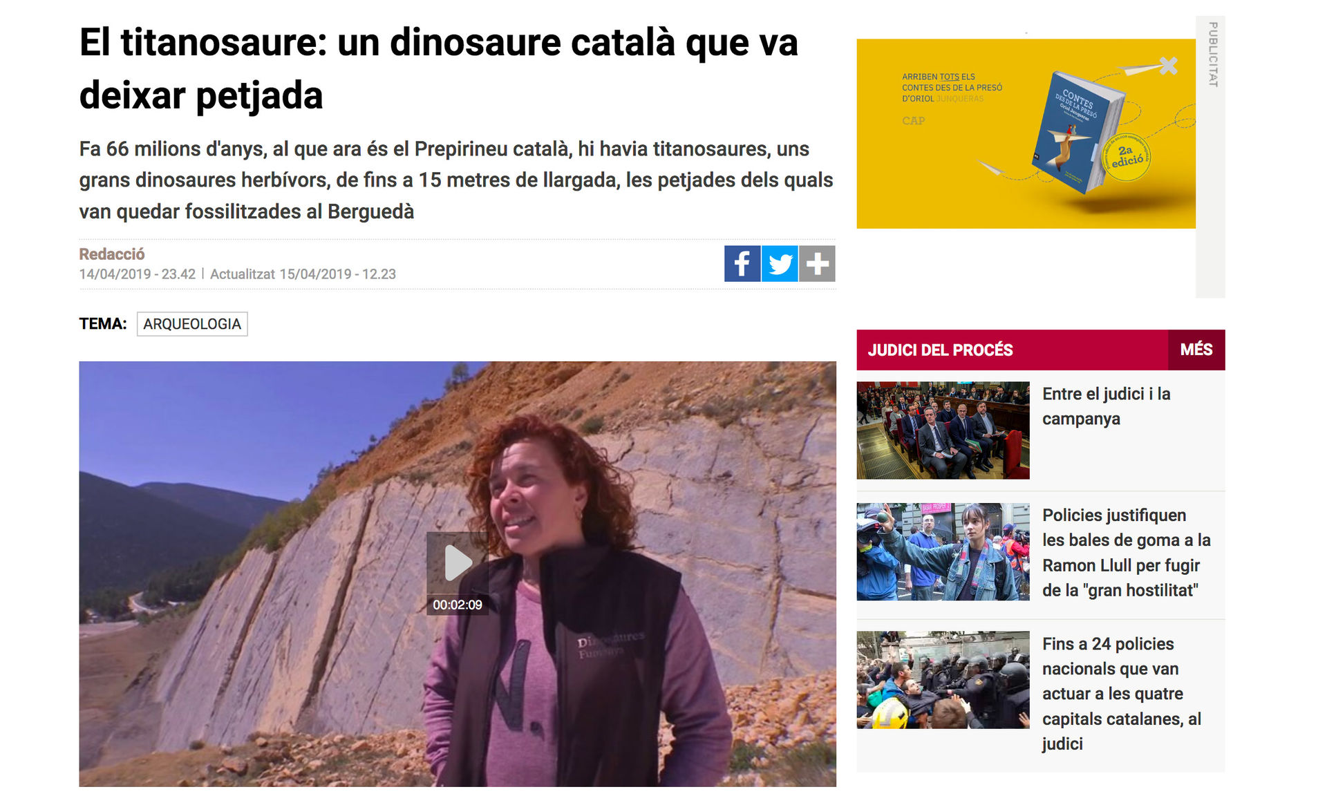 La televisión pública catalana acaba de descubrir el primer caso de dinosaurio específicamente catalán, según se desprende del titular de una noticia alusiva a un yacimiento arqueológico en el municipio barcelonés de Serchs (Cercs en catalán). "El titanosaurio, un dinosaurio catalán que dejó huella" es el encabezamiento con el que el canal difundía un reportaje sobre las 35.000 huellas de ese espécimen halladas en 1985, cuando se abandonó la explotación de las minas de carbón a cielo abierto.