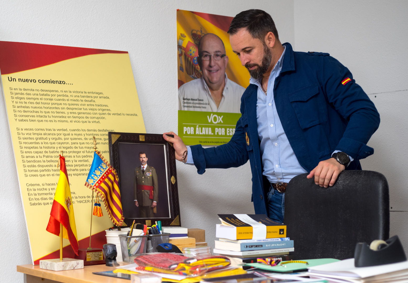La entrevista se desarrolla horas antes de que Vox sea excluido del debate de Atresmedia, que afrontaba "con tranquilidad". Acudimos a su despacho en el nuevo local que inauguraron hace apenas un mes: "Se nos quedó pequeño el día que lo abrimos", asegura Abascal señalando a algunos de los trabajadores y voluntarios que colaboran con Vox. En el camino le entregan cartas, le enseñan unas láminas de toros y le traen un cuadro de su padre y su tío montando a caballo en su tierra natal. En su día a día le acompañan fotos de sus cuatro hijos y su mujer, Lidia Bedman, ‘influencer’.