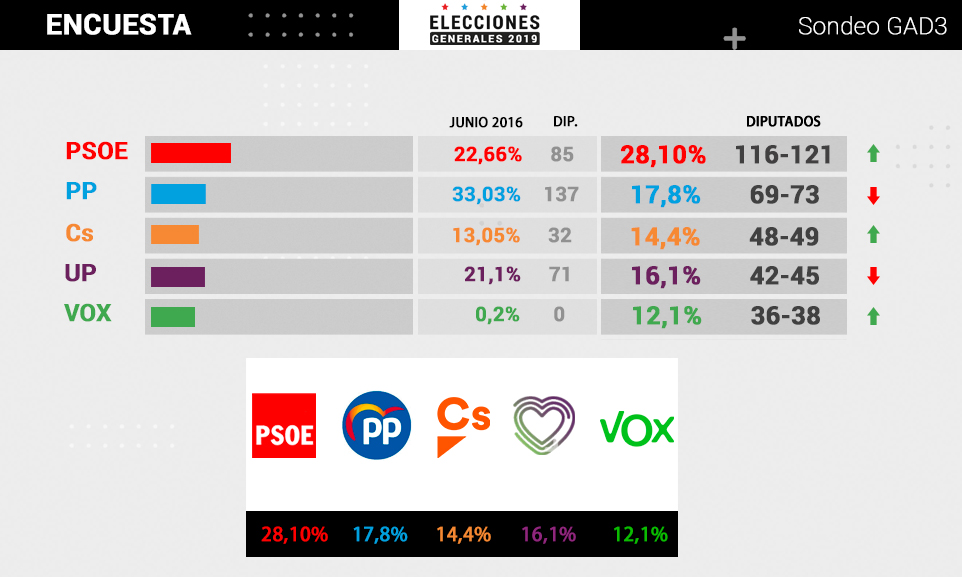 El tercer lugar en voto sería para Podemos con 16,10%, pero los de Iglesias se verían superados en escaños por Ciudadanos: el partido morado tiene un 16,10% de voto y entre 42 y 45 diputados, mientras que los de Rivera, con un 14,40% podrían llegar a 48 o 49 escaños. Vox, por su parte, tendría un 12,10% y entre 36 y 38 diputados.