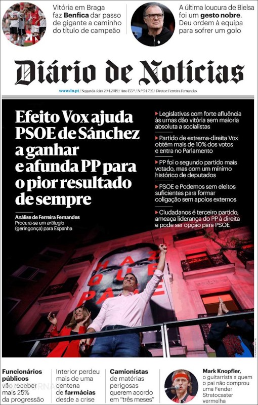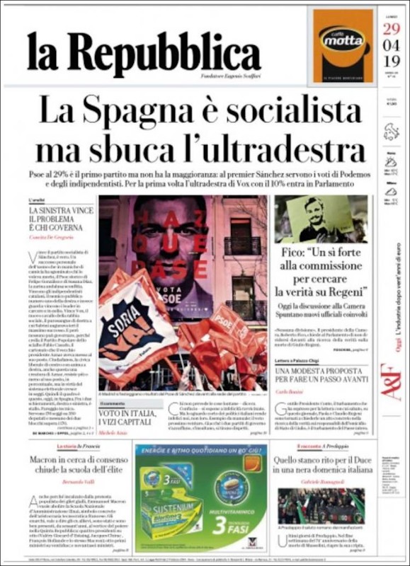 Después de la victoria de los socialistas en las urnas, el tema más mencionado ha sido la entrada del partido de ultraderecha, Vox, al Congreso de los Diputados, que ha pasado de los 47.182 votos que cosechó en 2016 a más de 2,6 millones de votos (10,26%) en estas elecciones. La publicación argentina, Clarín, señalaba en la mañana del lunes la "ilusión que despertó la irrupción de Vox" cuyo votantes eran o bien "nostálgicos que añoran el regreso de los valores de la España más tradicional" o bien ciudadanos que pertenecen a una "derecha rabiosa". En Italia, La Repubblica lleva las generales a la portada de su edición impresa y destaca la victoria de la izquierda y la entrada de Vox en el Parlamento: "Hace tres años había conseguido el 0,2% de los votos. Un resultado rotundo, aunque esperado dados los sondeos de los últimos meses".