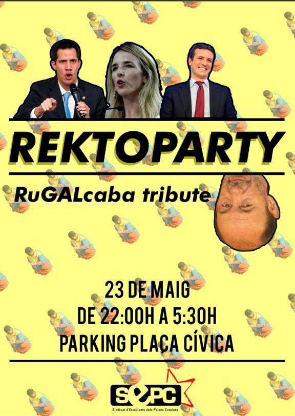 Pero también se acuerdan de los muertos y en concreto de Rubalcaba, cuyo cabeza boca abajo también ilustra el "póster" de la fiesta. La "Rektoparty" de este año, con el visto bueno oficial del rectorado de la Universidad Autónoma de Barcelona lleva por subtitulo "RuGALcaba tribute".