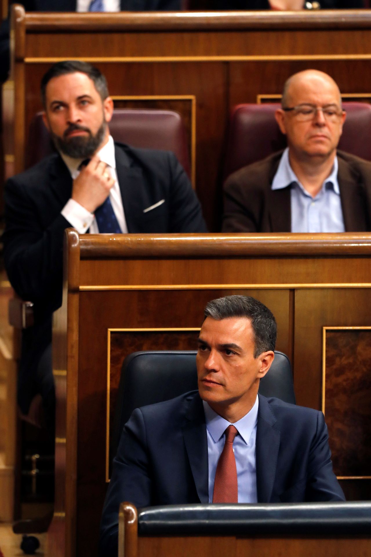 El presidente del Gobierno en funciones, Pedro Sánchez, el líder de Vox, Santiago Abascal y el parlamentario del PSC José Zaragoza.