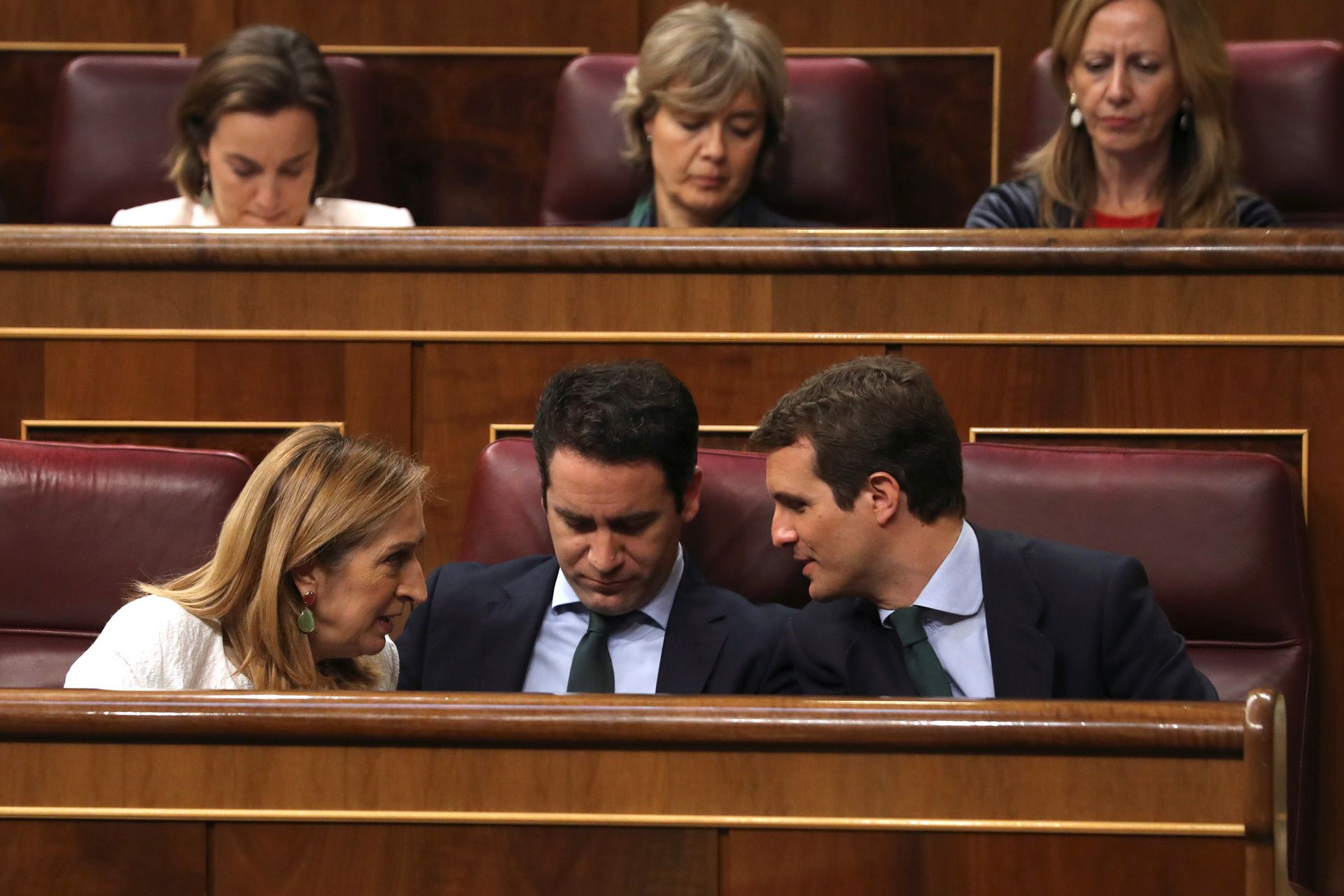 El presidente del PP, Pablo Casado, junto al secretario general del PP, Teodoro García Egea, y la hasta ahora presidenta del Congreso.