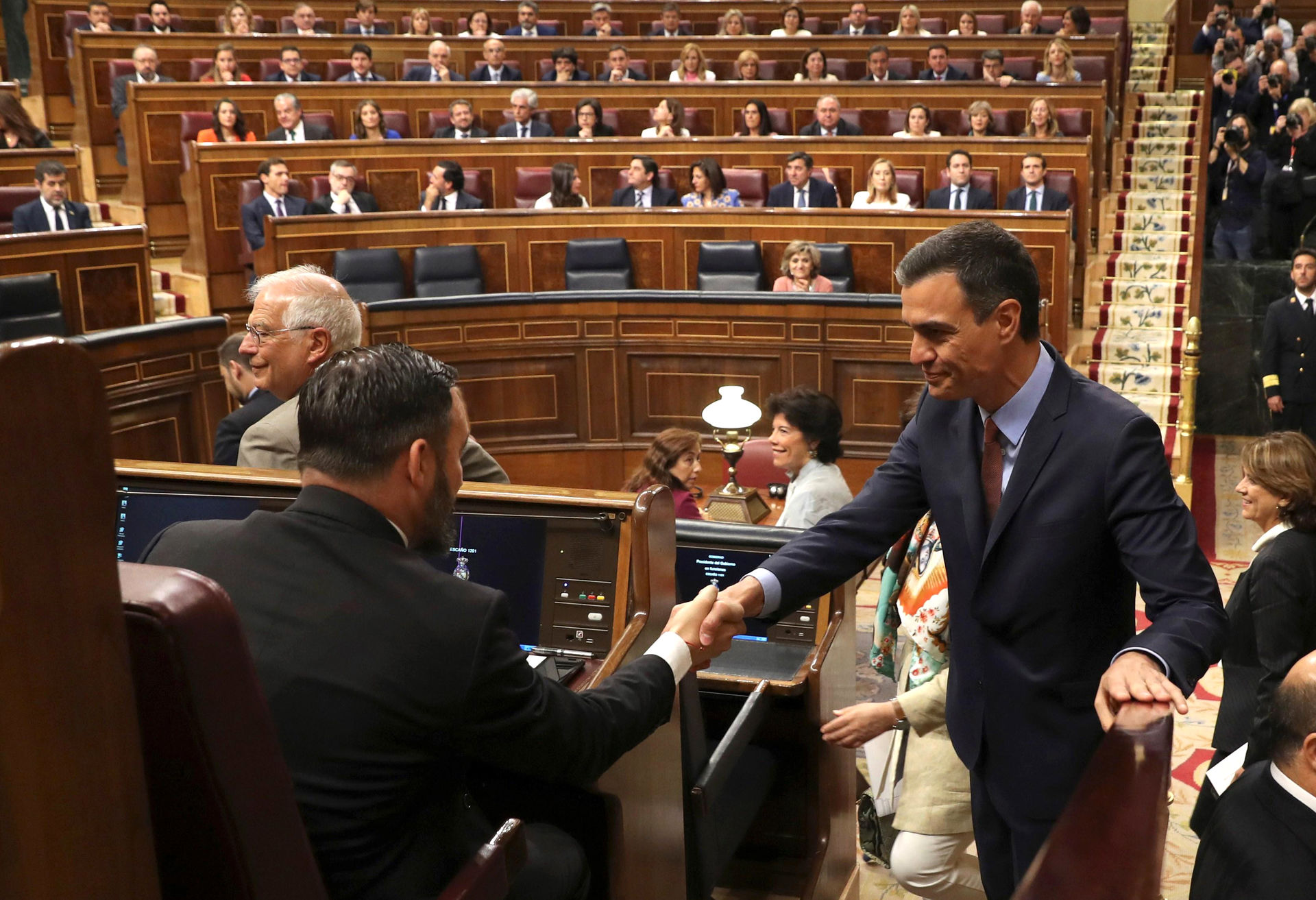 Pedro Sánchez saluda a Santiago Abascal en la bancada del Congreso de los Diputados.